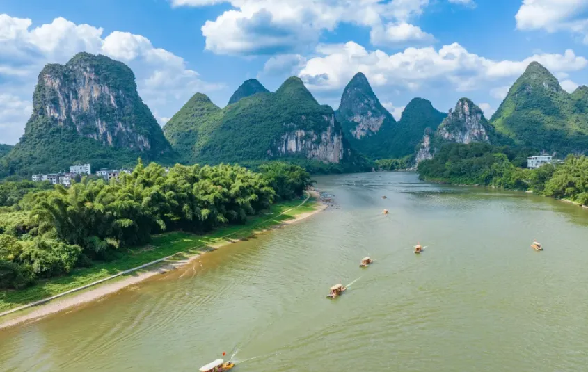 “江作青罗带,山如碧玉簪”,桂林漓江是喀斯特山水画廊,乘船游览漓江,两岸山峰连绵起伏,江水清澈碧绿,如同一幅展开的山水画卷,20 元人民币的背景图案就取自这里。