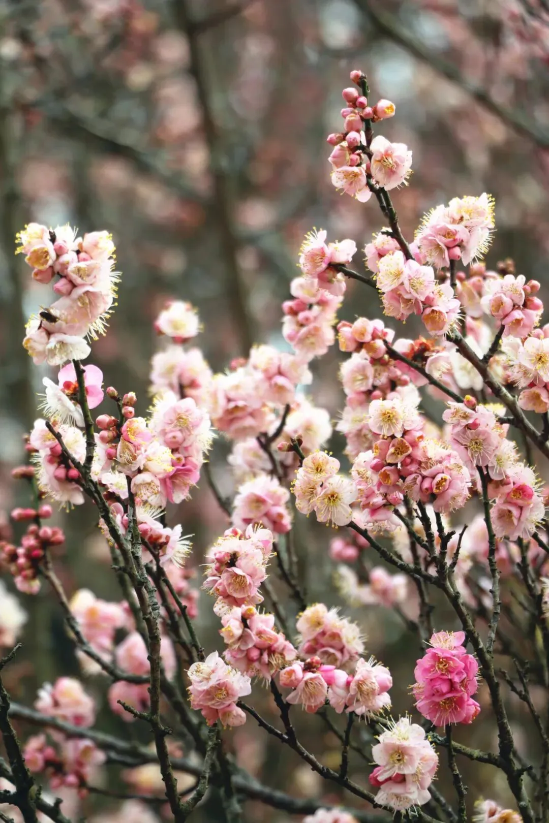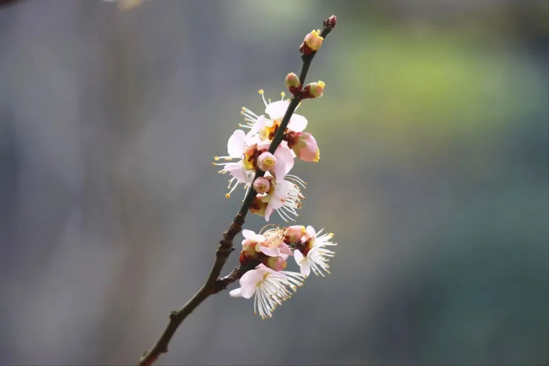 凑近前细观,别有一番韵味,盈盈动人的梅花从枝干里钻出来,有的展开两三片花瓣,如同待字闺中的少女,等待“嫁”与有缘人;有的花瓣儿全开,仿佛成熟的女性,一举一动之间,俱是迷人的风采;有的还是花骨朵儿,好似一个个可爱的小宝宝,总是惹人欢喜。