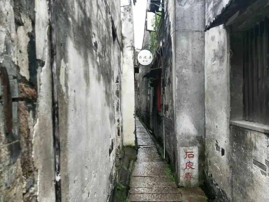 石皮弄在西塘西街的尽头,全长68米,由216块厚度仅三厘米的石板铺就而成,是王家尊闻堂与种福堂之间的过道。