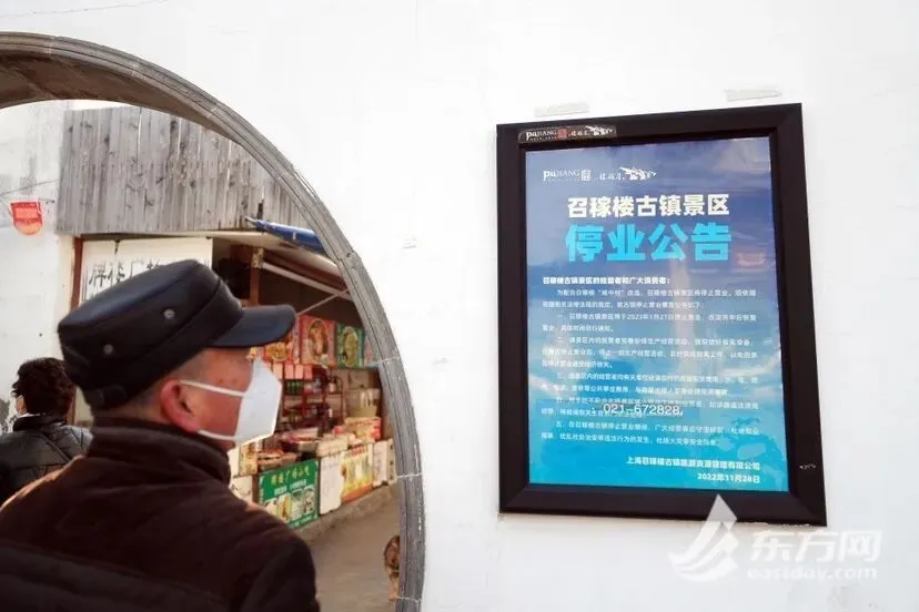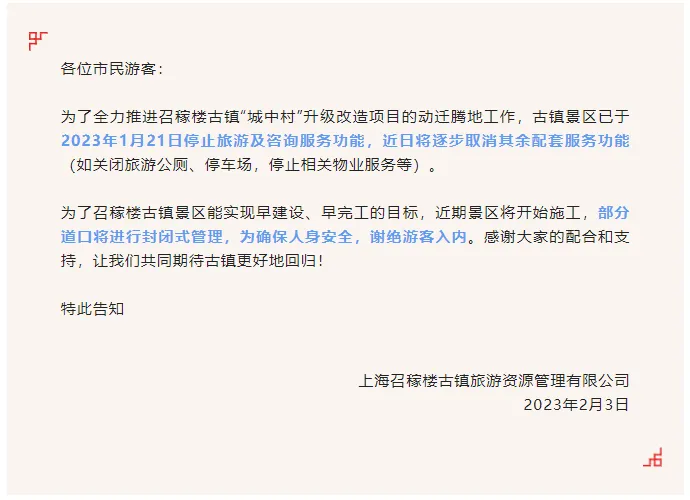告知书说,为了全力推进召稼楼古镇“城中村”升级改造项目的动迁腾地工作,古镇景区已于2023年1月21日停止旅游及咨询服务功能,近日将逐步取消其余配套服务功能(如关闭旅游公厕、停车场,停止相关物业服务等)。