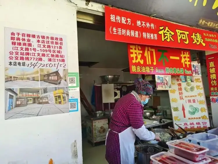 徐阿姨门店贴出了通知,“由于召稼楼古镇升级改造即将休业,本店迁往新召稼楼商圈:江文路121弄(江文路1号-109号区域)”。店员表示,现在的店会开到4月底,等改造好了还会回来。