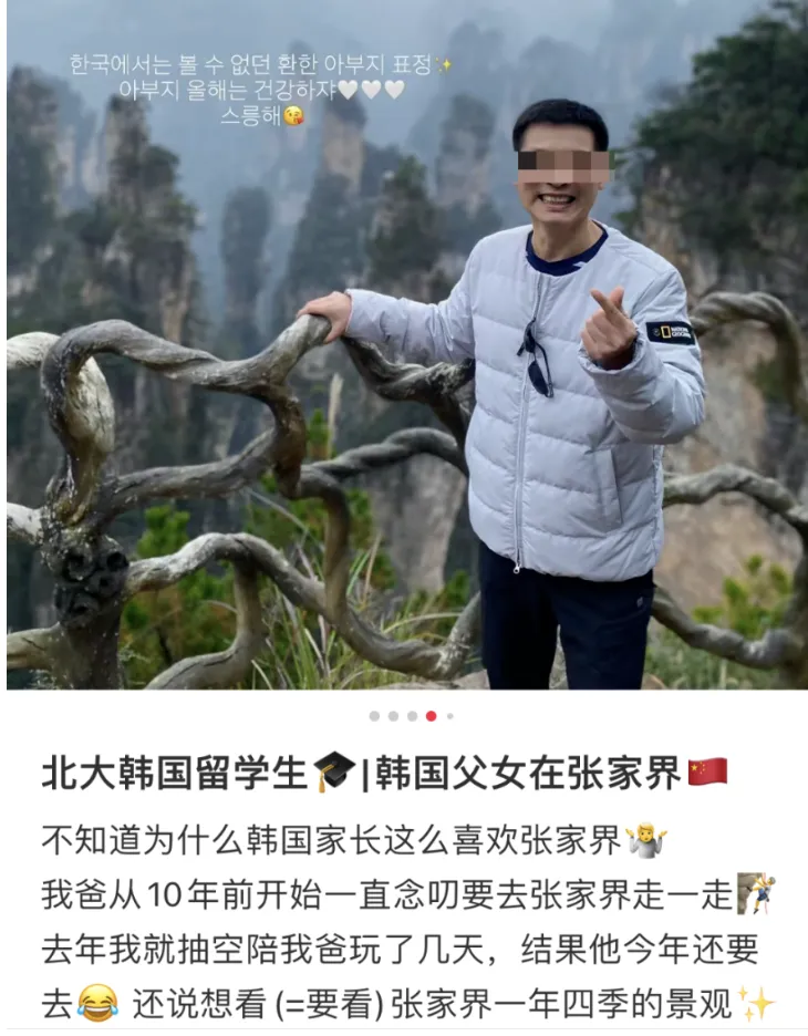 如果再往下翻翻,你很可能还会看到韩国网友们自己发布的张家界游记,配图往往是给父母拍的游客照,经典造型是身穿国家地理等韩国本土品牌的户外羽绒外套,胸前挂着墨镜,在张家界的某个拍照打卡点前面比心。