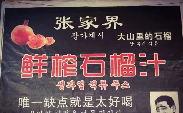 就连鲜榨石榴汁这种街边特产广告都是中韩双语,看着Yao的表情就知道口味非常可信。