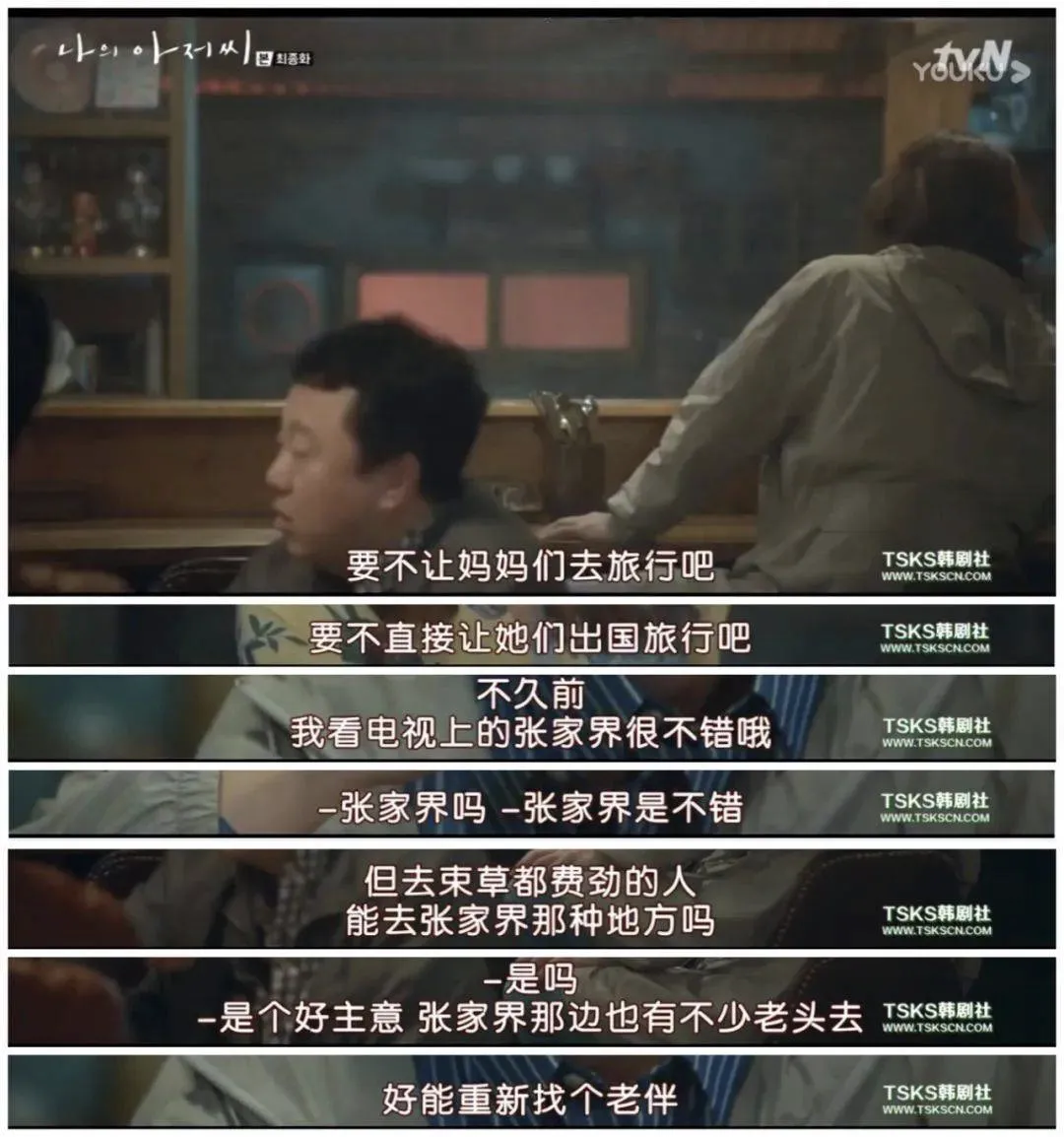 不只是韩国综艺爱往张家界扎堆,韩国影视剧里也动不动cue一下张家界。 2018年的热播韩剧《我的大叔》,里面有段剧情直接明牌了,年轻人们讨论想要把妈妈们送去张家界旅游,说不定还能在旅途中再找个老伴。