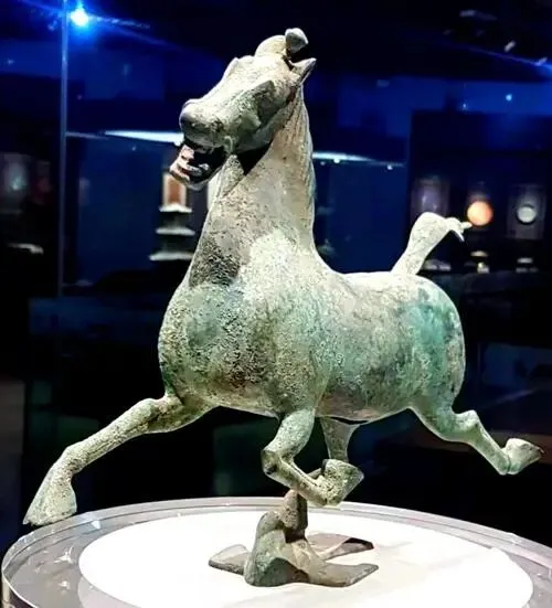 那尊马踏飞燕在这儿,东汉青铜,马抬三足,蹄下是鸟,身子像要飞起。