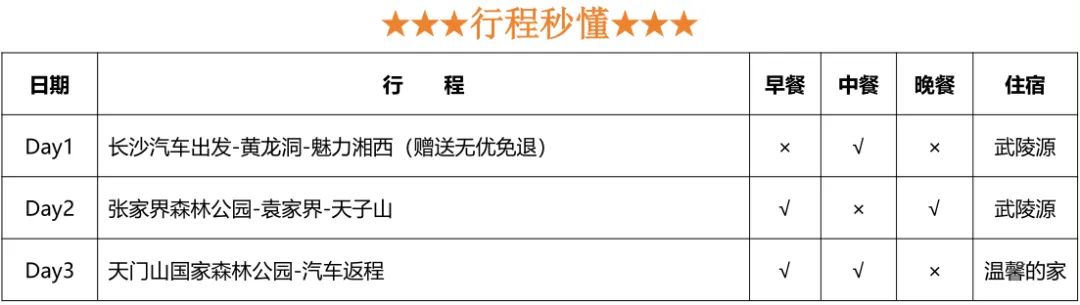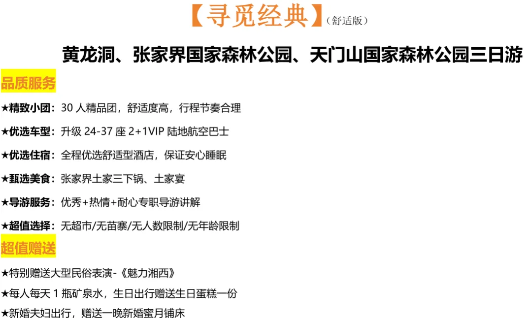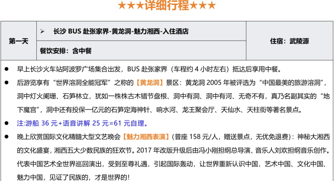 💛费用包含:往返车费+景区大门票+2晚住宿+2早餐3正餐+成人赠送魅力湘西表演+导游服务+保险