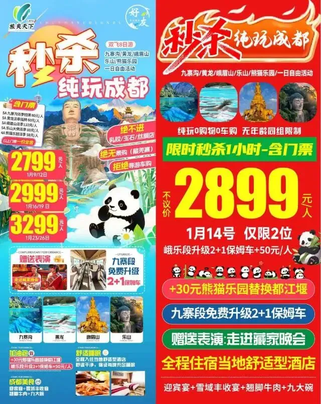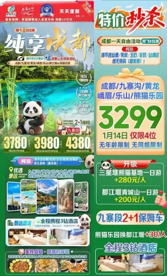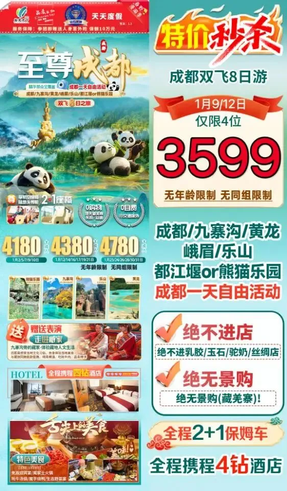 【肇东纵横旅游寒假团】1月14日秒杀纯玩成都特价8日游 最低秒杀价格