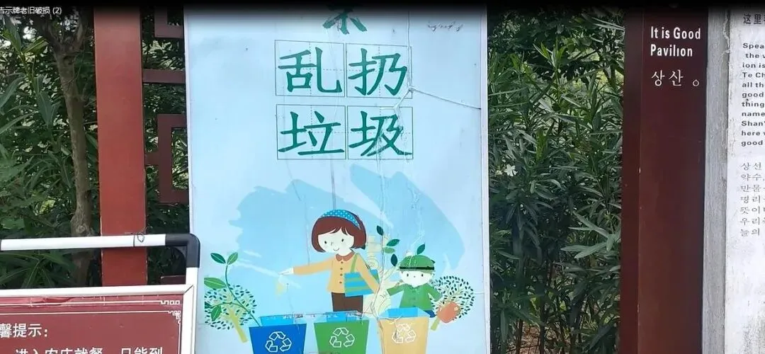 景区内部分标语和提示牌老旧破损,已及时更换。