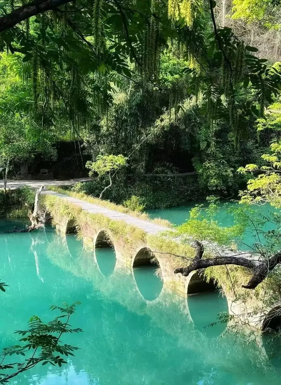 贵州·荔波小七孔 这儿的水绿得太不真实了!沿着栈道慢慢走,两边的树把天都遮住大半,满眼都是深深浅浅的绿。七孔古桥安静地卧在水上,阳光从树叶缝里漏下来,水面上闪闪发光,特别治愈。