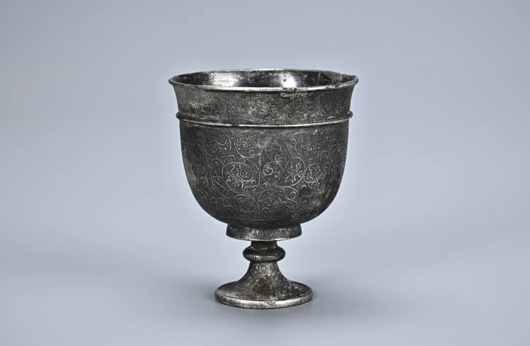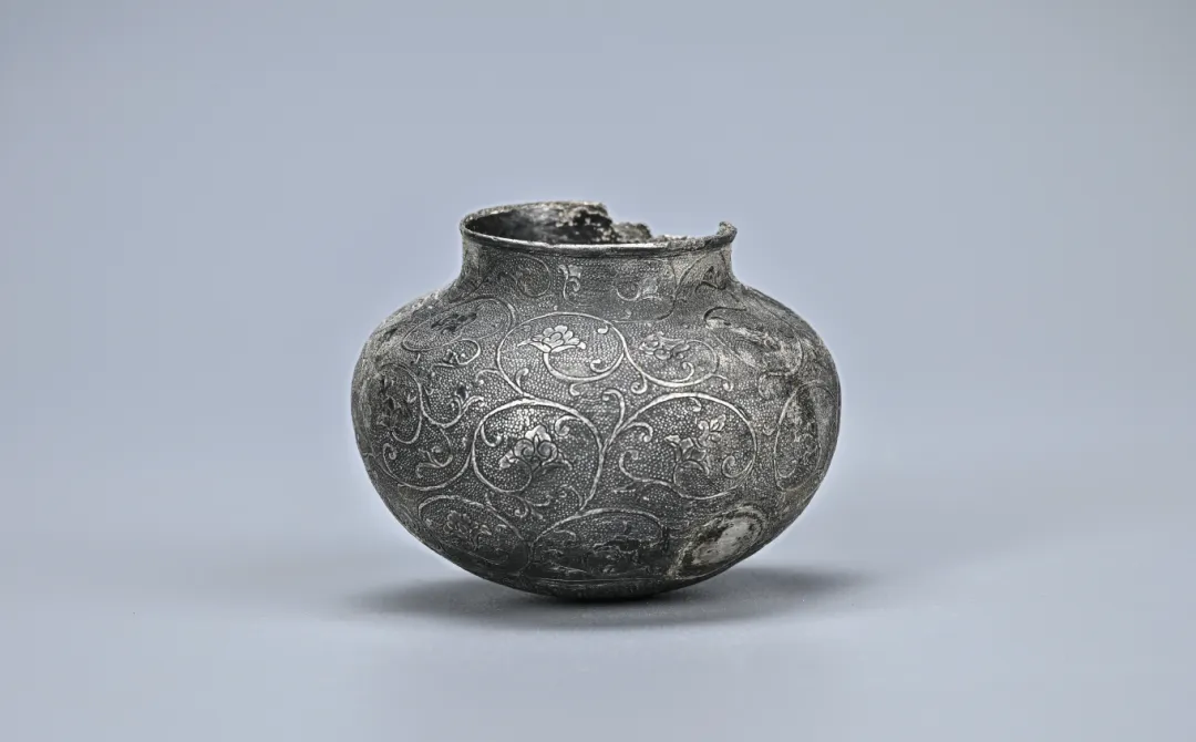 该墓随葬金银器多为女性发饰及盛贮器,尤以金钗、金梳背、银三足罐、银高足杯等金银器最为精美,且都很实用。其中银三足罐及银高足杯,纹饰繁复、制作华美,器身以葡萄忍冬纹为主纹,这种纹饰带有鲜明的西域文化特色,进一步说明了当时中原与西域地区交往密切,也体现了当时人们的审美情趣。