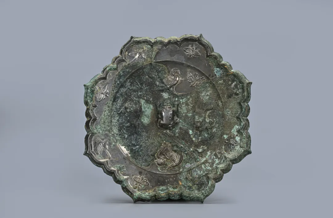 铜镜为八瓣莲花形,镜背分内外两区,内区凹陷,正中为伏兽钮,钮周饰瑞兽鸾鸟各一对,同向飞奔,间以花叶纹,外区边缘各瓣内间有喜鹊与蝴蝶。