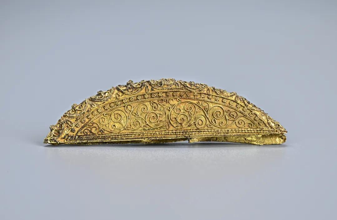 由两层月牙形金片合成,表面纹饰由掐丝及炸珠工艺制成。正背两面主纹饰为左右对称的卷草纹,边缘以两条金丝组成纹带,带内焊缀金粟花纹及联珠纹,底部两组绞丝纹。脊上排列九组金丝宝相花,边缘焊缀联珠纹。梳背中空,内残留块状白色包含物(牙质)。