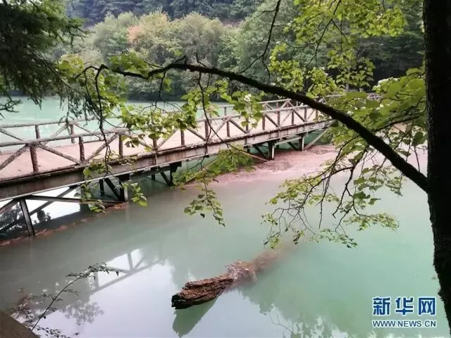 栈道损毁,清澈见底的蔚蓝海子已经浑浊不堪。阿坝州防指相关负责人介绍:
