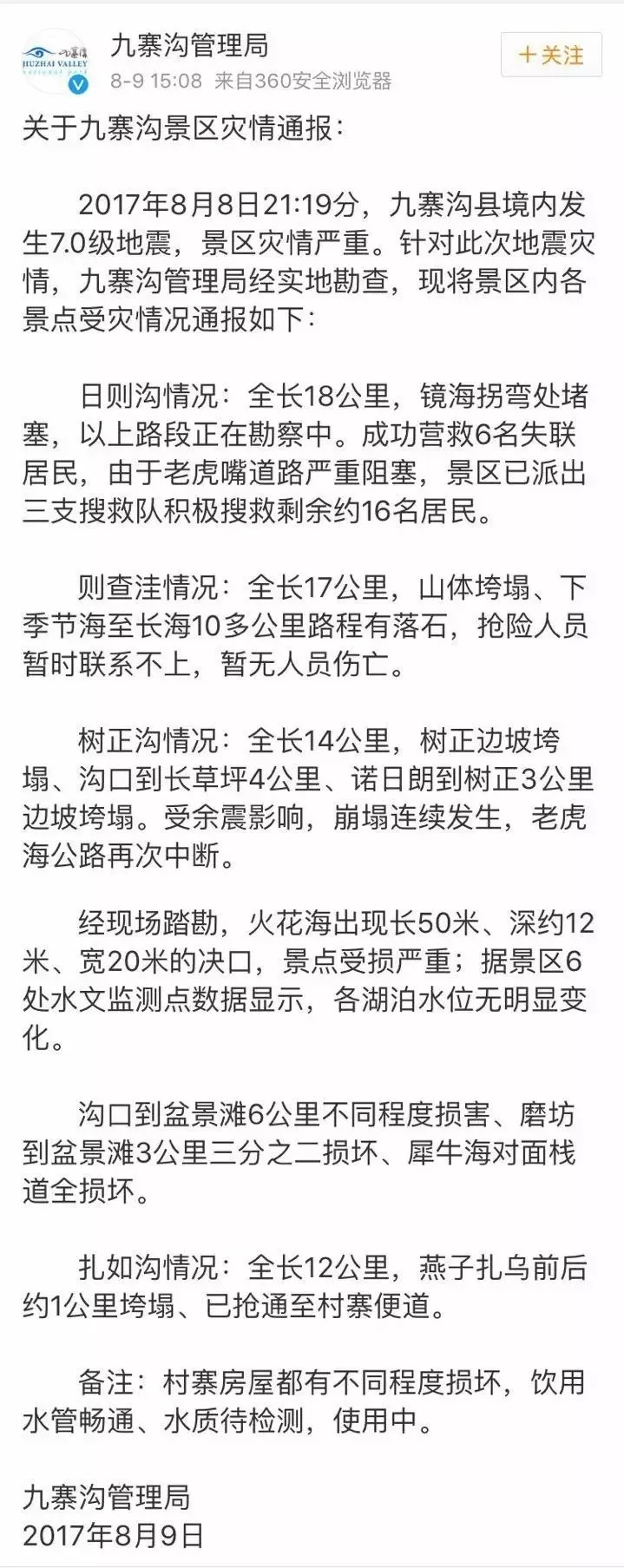 昨天下午3点左右,@九寨沟管理局 也发布了景区灾情通报: