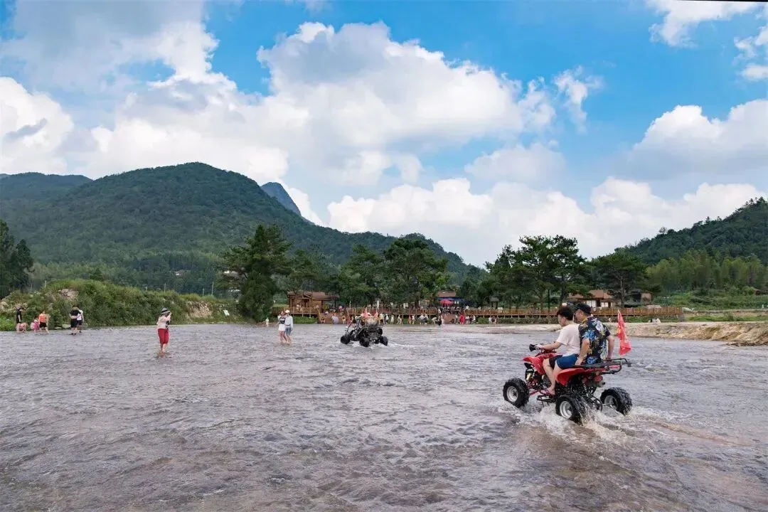 仙水洋就在西苑乡凤山村,溪面是一整块棕色的石头铺成的,平得跟家里的水泥地似的,顺着溪水能延伸近1公里,最宽的地方有50多米,水浅就到脚踝这,清澈得能看见水底的小鱼小石子,就像水上步行街一样,听说这景是亿万年前地壳运动,火山岩风化后,又被溪水冲了千百年才形成的。