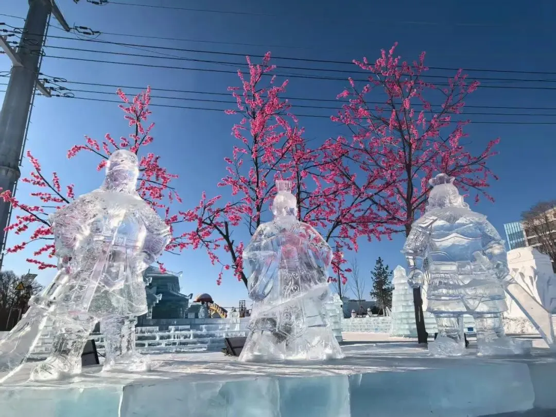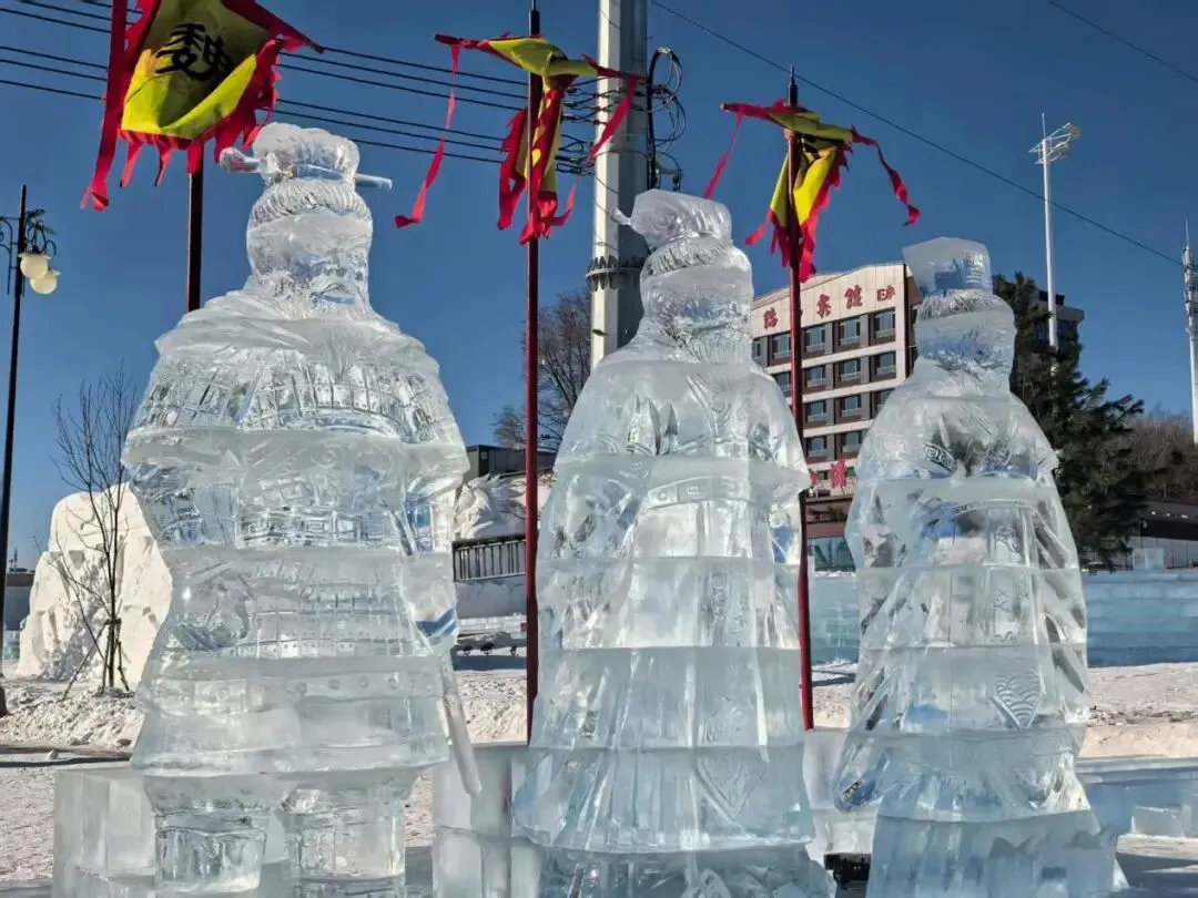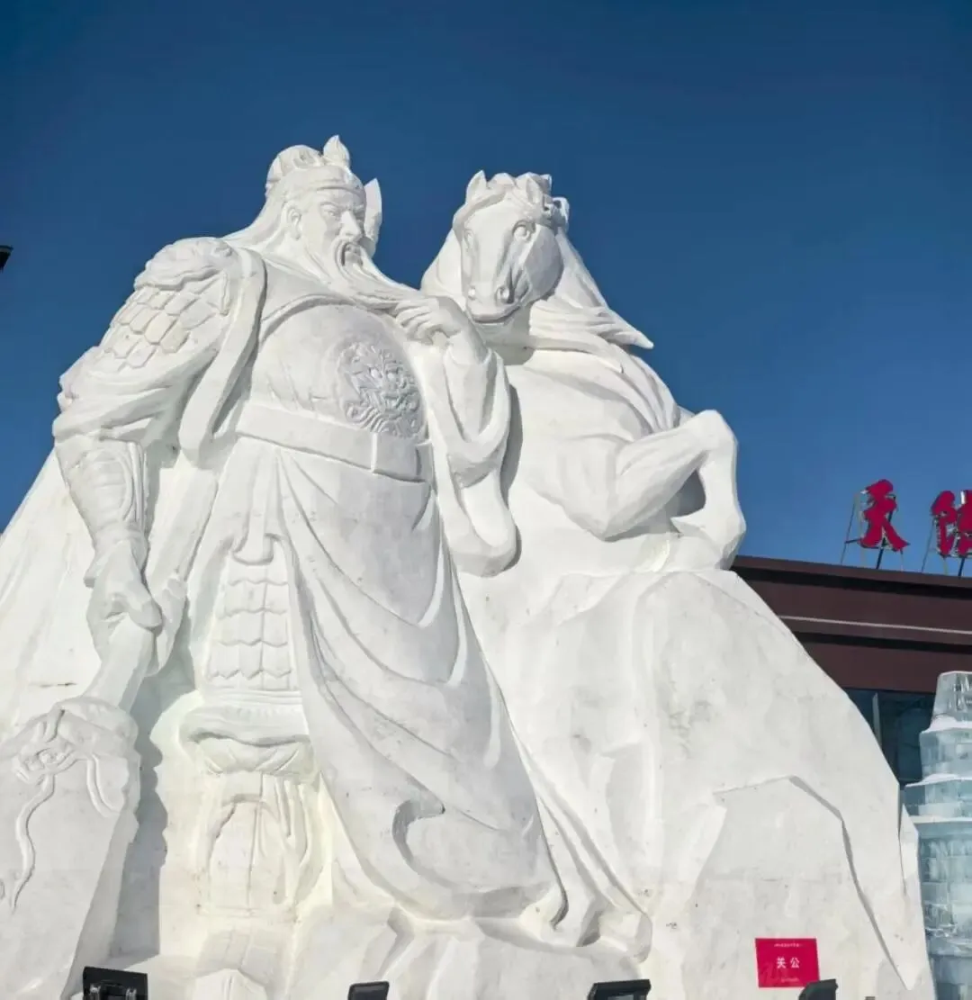 天陆山滑雪场门口还有三国主题的冰雕、雪雕,“桃园三结义”“青梅煮酒论英雄”“六大战神”等主题的冰雕、雪雕的场景再现,刻画的超传神!