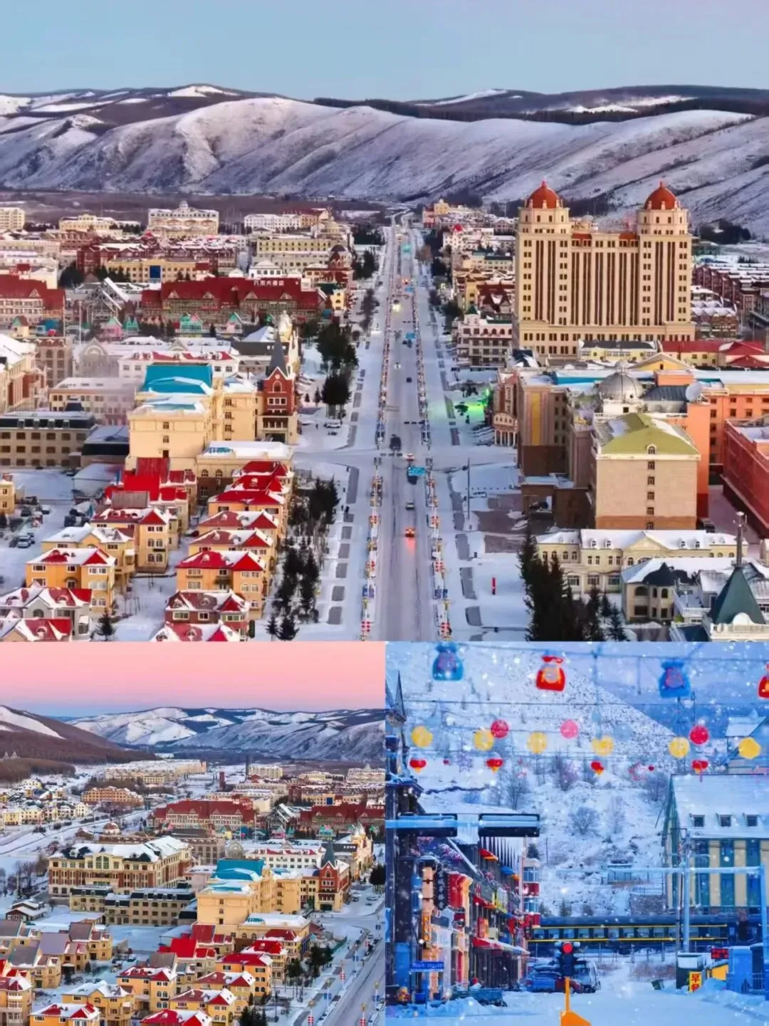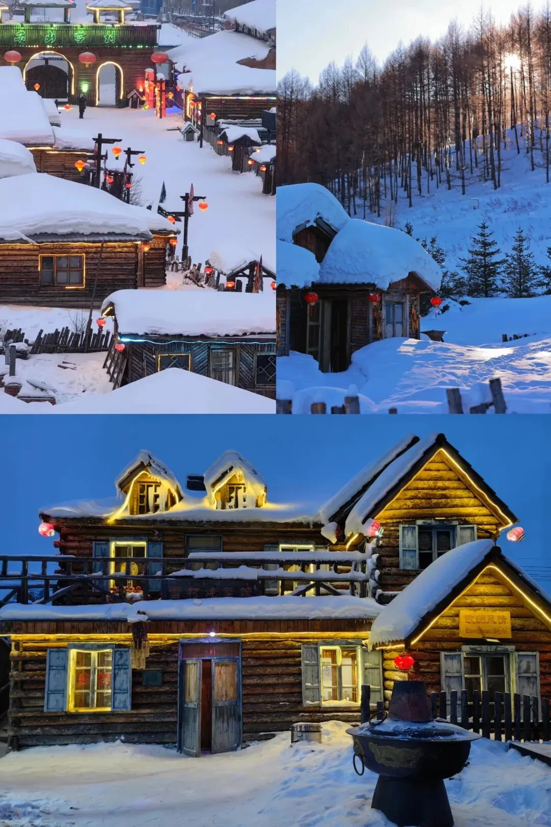 阿尔山雪村:木屋堆雪如可爱“雪蘑菇”,红灯笼映着暖黄灯火,夜晚炊烟袅袅升起,白雪与烟火碰撞,满是东北民俗的淳朴暖意。