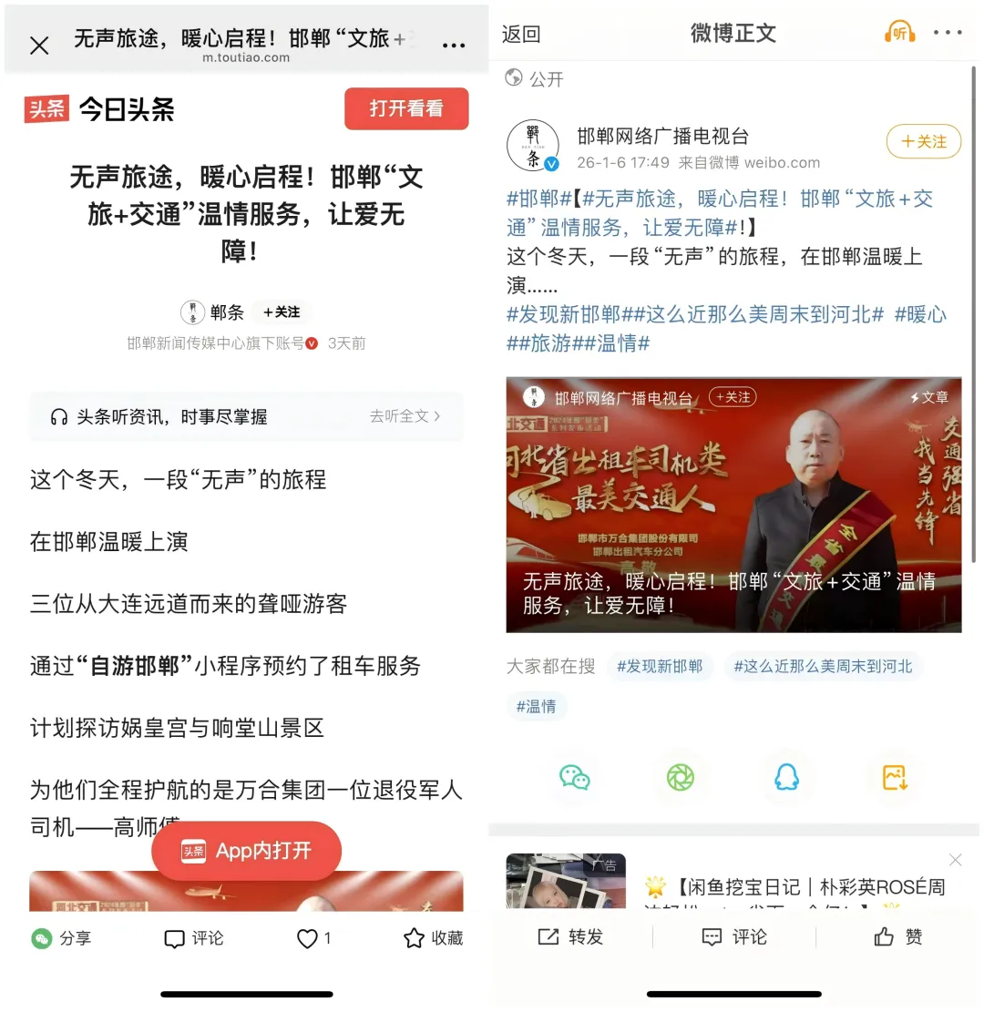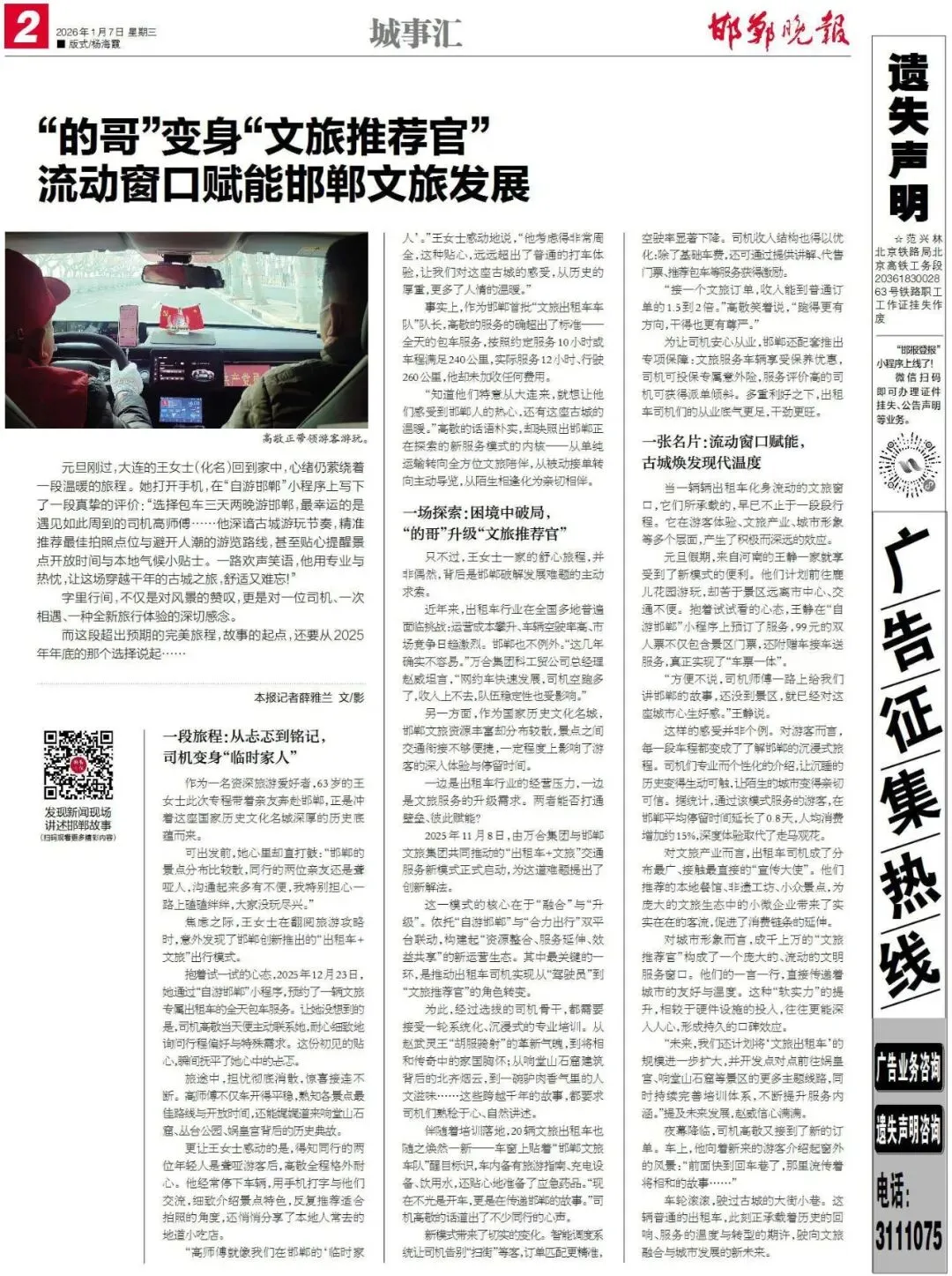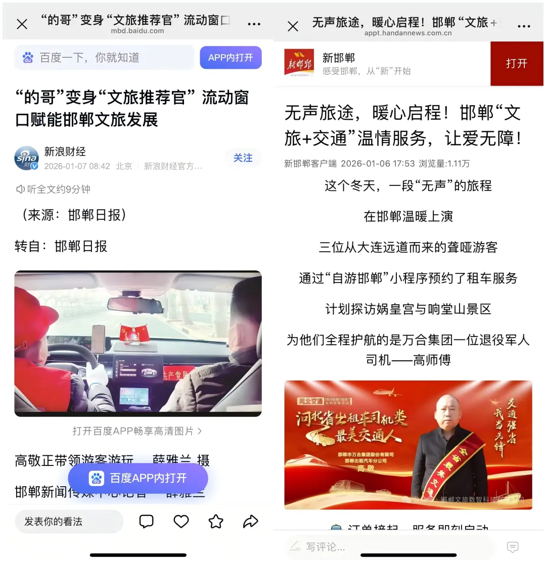 真心推荐!在邯郸旅游,用「自游邯郸」这个平台也太省心了吧!最近,无论是《邯郸日报》《邯郸晚报》 新邯郸、郸条还是新浪财经 都在报道咱们邯郸文旅 的一件暖心事儿 “的哥”变身“文旅推荐官” 一辆辆出租车成了古城的“流动文化窗口” 而出圈的背后,都离不开一个宝藏平台 “自游邯郸”小程序! 🎯 不止是交通工具 更是“可移动的旅行管家” 如果你以为这只是一个小程序 那就太小看它了! 来自大连的王女士带着 两位聋哑亲友来邯郸玩 出发前特别担心交通不便、沟通困难 没想到,在「自游邯郸」上预约的包车服务 却成了她们旅程中最温暖的记忆 司机高师傅不仅熟路线、懂历史 还主动用手机打字交流 耐心推荐拍照点位 分享只有本地人才知道的地道小吃 用王女士的话说 “他就像我们在邯郸的‘临时家人’” 而这,正是「自游邯郸」 推动的 “出租车+文旅”新模式 的日常 司机不再只是开车的人 而是懂讲解、有温度、会陪伴的文旅推荐官