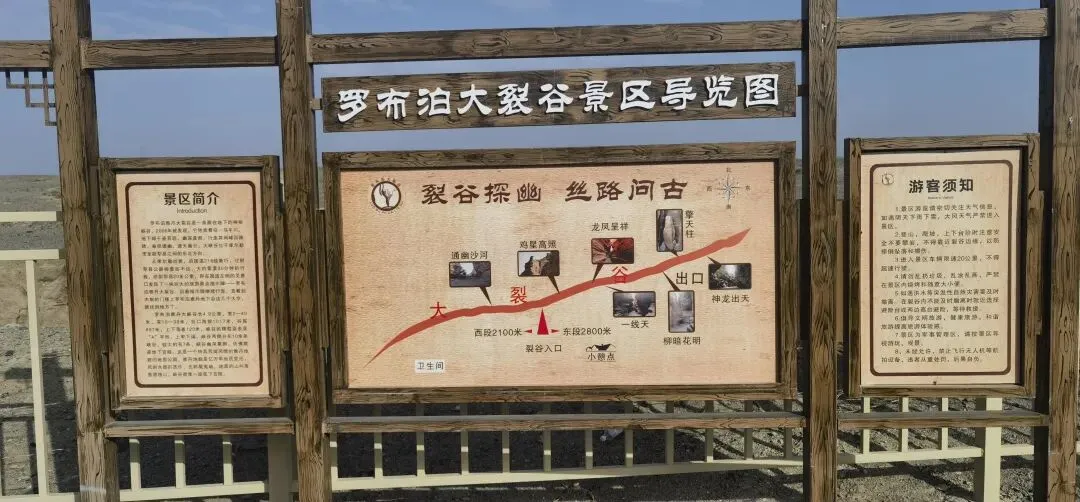 事前在网上查找学习了一下“罗布泊大裂谷”的相关信息。2024年10月11日,我们从尉犁县出发,根据网友的经验,在高德地图上导航设置目的地为“罗布泊大峡谷”,先是沿着G218国道,开到一个岔路口,看到路边指示牌写着“罗布泊大裂谷”,就转进这条路继续开,从尉犁县开车大约半小时左右就能到达景区售票处。由于导航问题,我们折腾了近一个多小时才到达景区。