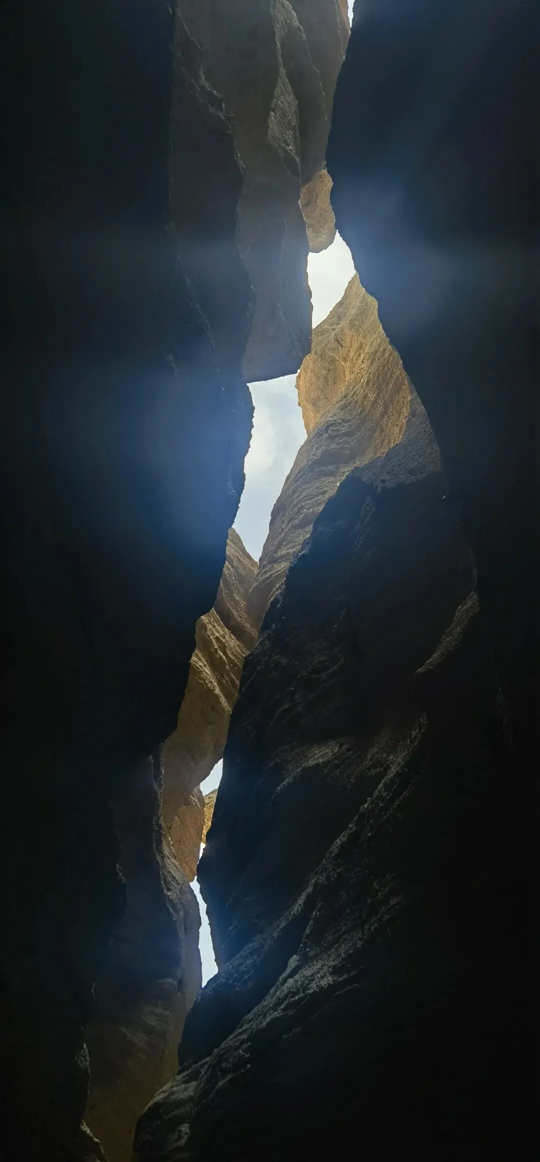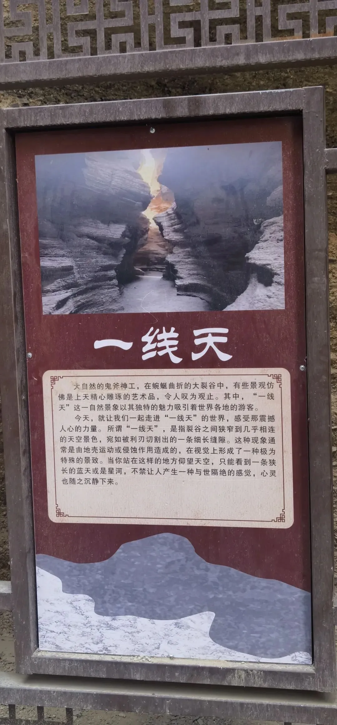 在这里,不用刻意找角度拍照,随手框住的都是亿万年的地质故事: 层叠的岩层像大地的年轮,狭窄的一线天漏下细碎的光,连谷底的凉风都带着岁月的粗粝。来时吐槽过搓板路的颠簸,抱怨过没信号的不便,可真要离开,却总想起触摸岩壁时的冰凉,和抬头望见岩缝中的苍穹时的震撼。