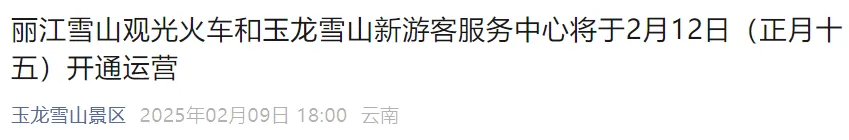 定了!丽江雪个知名景区观光火车12日正式开通,票价→据“玉龙雪山景区”微信公众号消息 2月12日9:00起 丽江雪山观光火车将正式开通