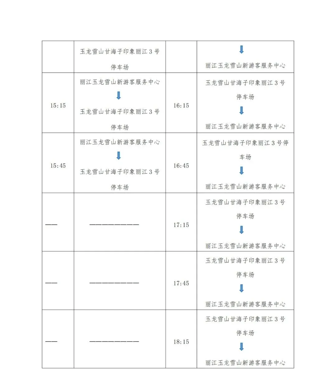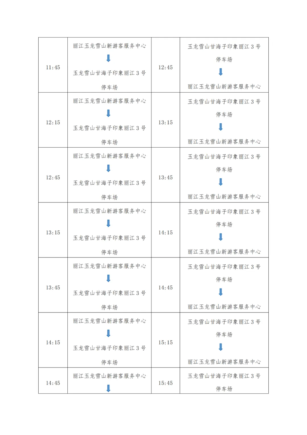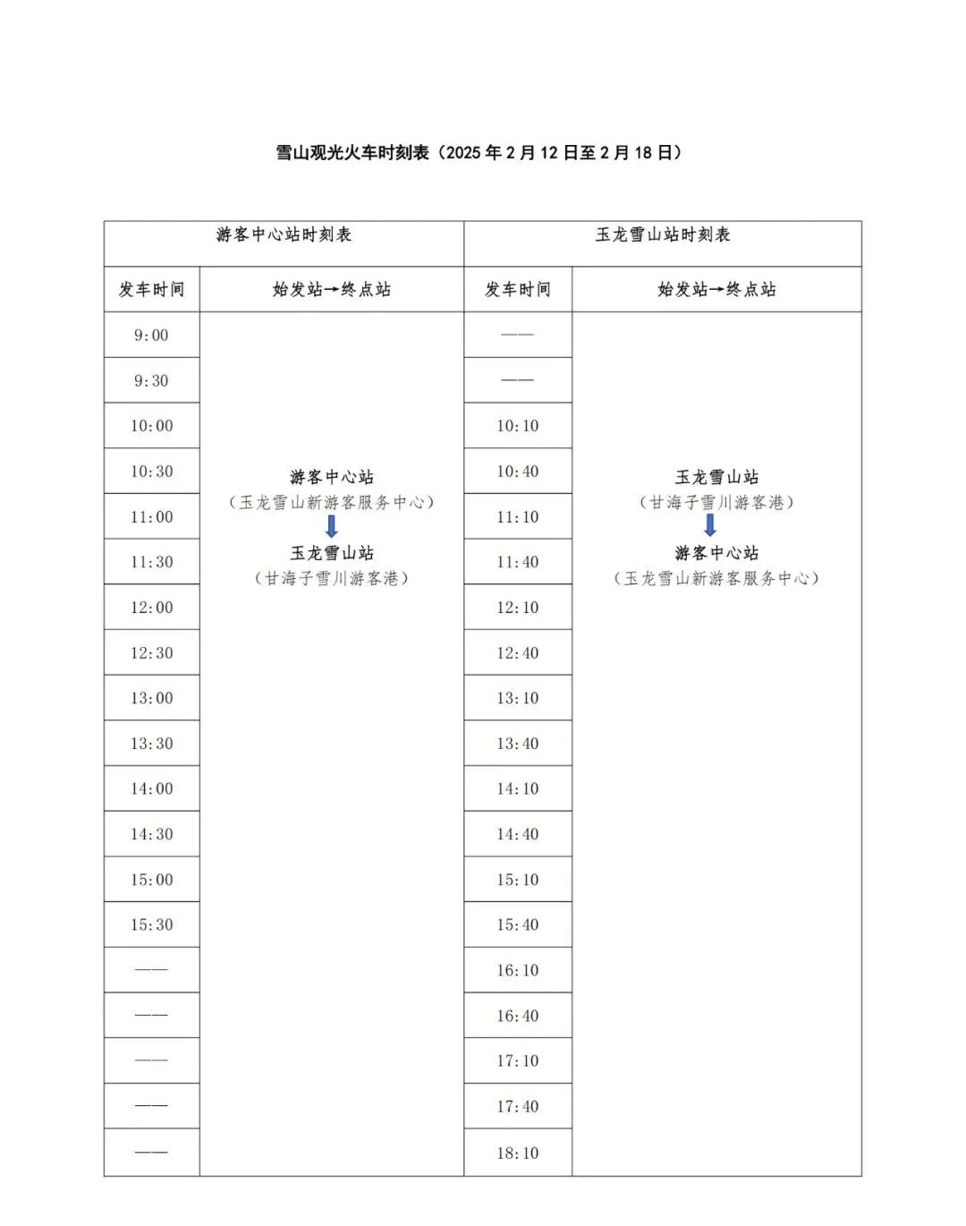 (二)初期运营第二周及后续:运营时刻表另行发布,请关注“雪山火车”微信官方小程序、“丽江雪山轨道交通有限公司”微信官方公众号或“列车驶向云端”微信公众号获取最新信息。 二、售检票安排 根据《云南省游览参观点门票价格管理实施办法(暂行)》及《关于丽江观光火车一期票价(试行)的公告》的相关规定,开通初期预售游客中心站至玉龙雪山站往返票及单程票,在公示价格基础上予以一定的优惠,具体票价及政策如下: (一)票种价格: 1.往返票价:80元/人 2.单程票价:50元/人 游客朋友可根据行程规划选择往返或单程票种,并按时刻表乘坐。 (二)半票优惠政策: 适用于6周岁以上(不含6周岁)至14周岁以下(含14周岁)儿童、1.2米至1.5米(含1.5米)儿童、现役军人、消防救援人员及持有有效证件的残疾人。往返票价:40元/人,单程票价:25元/人。 (三)免票优惠政策: 适用于6周岁(含6周岁)以下儿童、1.2米(含1.2米)以下儿童及持有效导游证件的导游。 (四)购票渠道: 即日起可通过以下四种渠道提前7天购票: 渠道一:通过公司旗下“雪山火车”微信官方小程序购买雪山观光火车票。 渠道二:通过公司旗下“丽江雪山轨道交通有限公司”微信官方公众号购买雪山观光火车票。 渠道三:通过公司授权的“丽江旅游集团”微信小程序中“观光火车”售票入口购买雪山观光火车票。 渠道四:通过公司授权的“丽江玉龙雪山”微信公众号中“雪山观光火车票”售票入口购买雪山观光火车票。 (五)检票方式: 为减少排队候车时间及保障乘车秩序,雪山观光火车仅售有座票,请您按照所购买车票乘车时段检票进站乘车,具体检票方式如下: 1.凭购票的身份证检票乘车。 2.凭购票二维码检票乘车。 三、温馨提示 (一)进入玉龙雪山景区须另行购买景区门票,雪山观光火车作为进入玉龙雪山景区的交通方式之一,车票不包含玉龙雪山景区门票,请您通过“丽江玉龙雪山”微信公众号提前或在玉龙雪山新游客服务中心现场购买玉龙雪山景区门票,依次验票后,乘坐雪山观光火车进入景区。 (二)为了提供更好的乘车观光体验和减少排队候车时间,试运营第一周原则上雪山观光火车票只开放线上预售。 (三)请您严格按票面明确的乘车时段乘车,合理做好旅行规划,以免耽误行程。如错过乘车时刻,需另行预约乘车时段。 (四)如有疑问或需要帮助,请咨询现场工作人员或拨打咨询热线:0888-3022888。 (五)如后期上述运营事项调整将另行公告。 丽江雪山轨道交通有限公司 2025年2月9日 尊敬的游客朋友们: 为优化玉龙雪山景区服务体验,缓解景区旅游高峰期交通压力,新建的玉龙雪山新游客服务中心将于2025年2月12日(农历正月十五)正式启用。届时新游客服务中心至玉龙雪山甘海子的旅游直通车也将同步开通运营,现将旅游直通车开通运营的有关事宜公告如下: 一、运行站点和时间安排 玉龙雪山新游客服务中心旅游直通车,始发站为新游客服务中心(位于丽江市玉龙纳西族自治县白沙镇木都村委会东文一组玉甘路1号,丽江文化旅游学院往北2.6公里、隧道以北约200米处),终点站为玉龙雪山景区甘海子“印象丽江3号停车场”,行车线路全长22公里,沿线无中间停靠站点。 运营初期,玉龙雪山新游客服务中心站发往玉龙雪山甘海子站的旅游直通车每日运营时间为:首班车9:15、末班车15:45,每班发车间隔时间为30分钟,单程行车用时约40分钟;玉龙雪山甘海子站发往玉龙雪山新游客服务中心站的旅游直通车运营时间为:首班车10:15、末班车18:15,每班发车间隔时间为30分钟,单程行车用时约40分钟。 具体运营时间详下表: