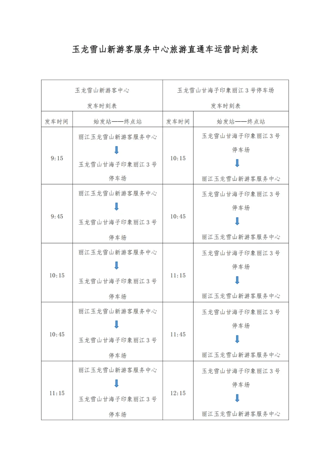 此外 新建的玉龙雪山新游客服务中心同步启用 新游客服务中心至玉龙雪山甘海子的 旅游直通车也将同步开通运营 详情如下↓ 玉龙雪山省级旅游开发区管理委员会 关于正式启用玉龙雪山新游客服务中心的公告 尊敬的游客朋友、各旅游接待单位: 为优化玉龙雪山景区服务体验,缓解景区旅游高峰期交通压力,新建的玉龙雪山新游客服务中心将于2025年2月12日(农历正月十五)正式启用。雪山观光火车将同步试运营,新游客服务中心到玉龙雪山甘海子的景区旅游直通车也将同步开通。为了让您有一个舒适便捷的雪山之旅,现将有关事宜公告如下: 一、玉龙雪山新游客服务中心地址 丽江市玉龙纳西族自治县白沙镇木都村委会东文一组玉甘路1号(丽江文化旅游学院往北2.6公里处,隧道以北约200米),全程交通便利,方便您轻松抵达。玉龙雪山新游客服务中心配备了2180个停车位并配有新能源车辆充电设施。 二、交通服务方式 (一) 雪山观光火车 由丽江雪山轨道交通公司作为运营主体,市场化自主运营。运行站点和时间:新游客服务中心至玉龙雪山景区,试运营第一周(2025年2月12日—2月18日):玉龙雪山新游客服务中心(游客中心站)至甘海子雪川游客港(玉龙雪山站)运营时间9:00—15:30,其中游客中心站首班车9:00、末班车15:30;甘海子雪川游客港(玉龙雪山站)至玉龙雪山新游客服务中心(游客中心站)运营时间10:10—18:10,其中玉龙雪山站首班车10:10、末班车18:10;每班发车间隔30分钟,单程运行时间约35分钟。 购票方式:通过“雪山轨道”微信小程序或“丽江雪山轨道交通有限公司”微信官方公众号提前实名预约购票,咨询电话:0888—3022888 (二)玉龙雪山景区旅游直通车 由丽江玉龙雪山旅游观光车有限公司作为运营主体,市场化自主运营。运行站点和时间:玉龙雪山新游客服务中心至玉龙雪山景区同步开通旅游直通车,起点站从新游客服务中心发车,终点站为玉龙雪山景区甘海子印象丽江3号停车场。初期,玉龙雪山新游客服务中心站至玉龙雪山甘海子,运营时间为9:15—15:45,其中玉龙雪山新游客服务中心站首班车9:15、末班车15:45;玉龙雪山甘海子印象丽江3号停车场至玉龙雪山新游客服务中心站运营时间10:15—18:15,其中玉龙雪山站首班车10:15、末班车18:15;每班发车间隔30分钟,单程运行时间约40分钟。 购票方式和地点:通过玉龙雪山新游客服务中心售票窗口现场购票。玉龙雪山新游客服务中心至玉龙雪山甘海子印象丽江3号停车场往返票价为60元/人次,单程为30元/人次,游客朋友可根据个人喜好自主选择往返或单程票种,并按时刻表乘坐。 咨询服务电话:13398888456 (三)玉龙雪山景区原有交通通达方式维持不变 游客朋友可以选择在玉龙雪山新游客服务中心乘坐雪山观光火车或景区直通车进入甘海子,也可选择自驾或乘坐其他交通工具经原路线进入玉龙雪山景区甘海子(门票核验方式不变)。 三、票务须知 雪山观光火车、景区旅游直通车、自驾、网约、出租车等作为进入玉龙雪山景区甘海子的交通方式之一,均不包含玉龙雪山景区门票。进入玉龙雪山景区须另行购买景区门票,玉龙雪山景区门票可通过“丽江玉龙雪山”官方小程序提前购买,也可在玉龙雪山新游客服务中心或景区入口处现场购买。 玉龙雪山景区索道票务请关注“丽江旅游集团”官方微信公众号或小程序 景区咨询服务电话:0888—5131068 雪山观光火车咨询服务电话:0888—3022888 玉龙雪山景区旅游直通车咨询服务电话:13398888456 玉龙雪山索道票务咨询服务电话:0888—8889999 玉龙雪山景区将持续为您提供优质服务,祝您旅途愉快! 丽江玉龙雪山省级旅游开发区管理委员会 2025年2月9日 丽江雪山轨道交通有限公司