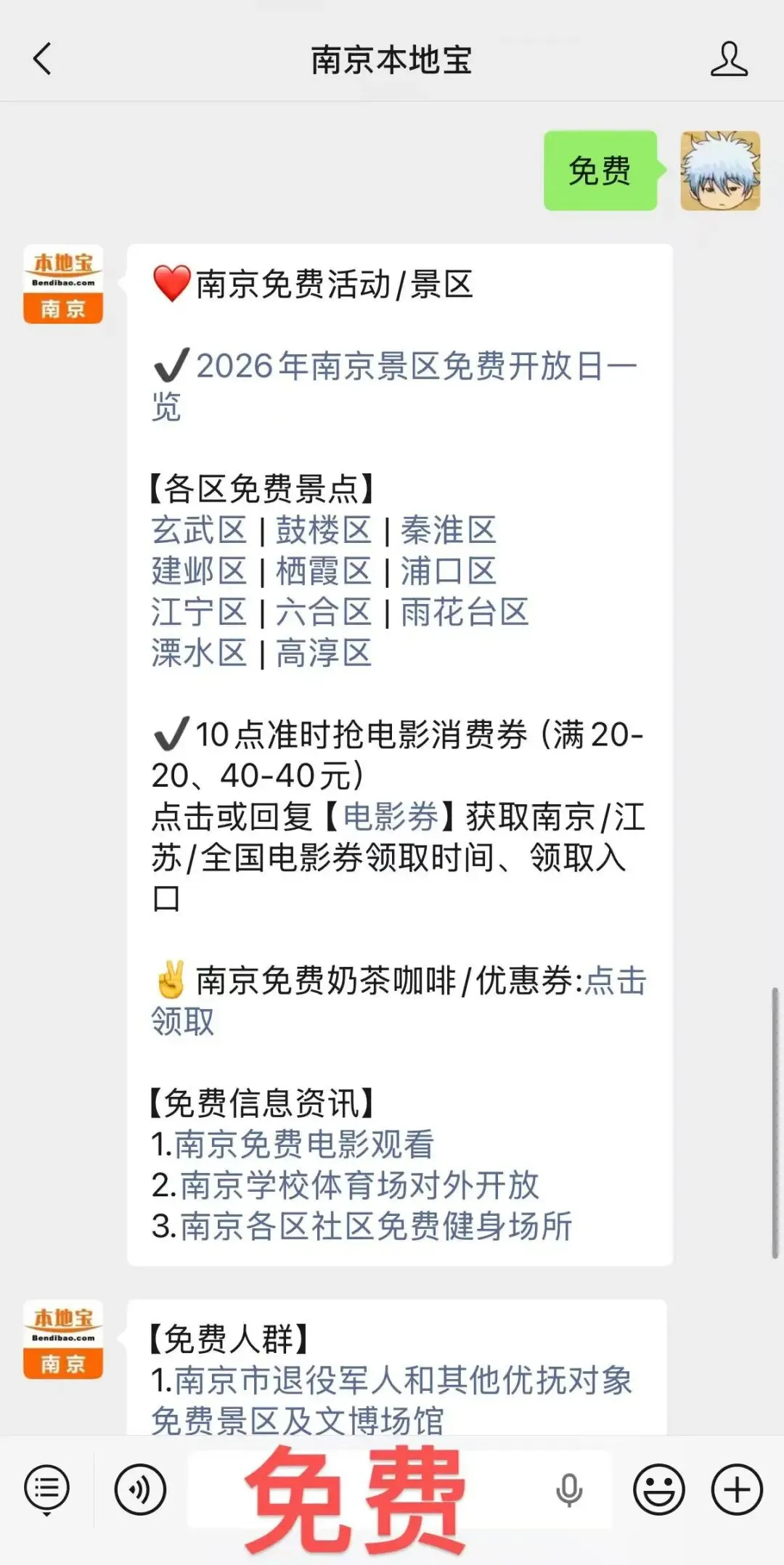 小编提醒:扫描下方二维码,关注【南京本地宝】,后台对话框回复【免费】即可获取更多南京免费景区、2026南京景区免费开放日安排等。