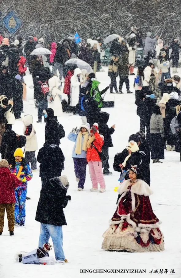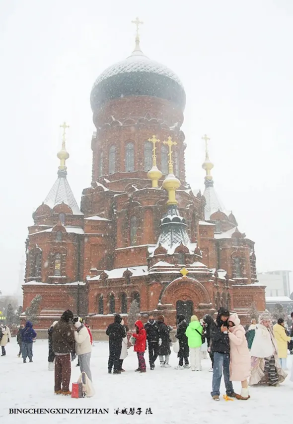 雪势渐密,索菲亚教堂的红砖纹路被薄雪轻柔覆盖,墨绿色穹顶在皑皑雪色映衬下,更显庄严柔美,俨然成为游人心中的“童话城堡”。广场上,如织的游客如灵动音符跃动于素白天地间,身着蕾丝裙装、复古头纱披肩的“公主们”与西装革履的“王子们”结伴而行,以教堂为背景定格冰城独有的欧式浪漫。众多博主架起设备直播,镜头里,雪花落满发梢眉睫,游人笑容明媚灿烂,与教堂的静谧肃穆相映成趣,勾勒出独属于索菲亚广场的冬日烟火盛景。