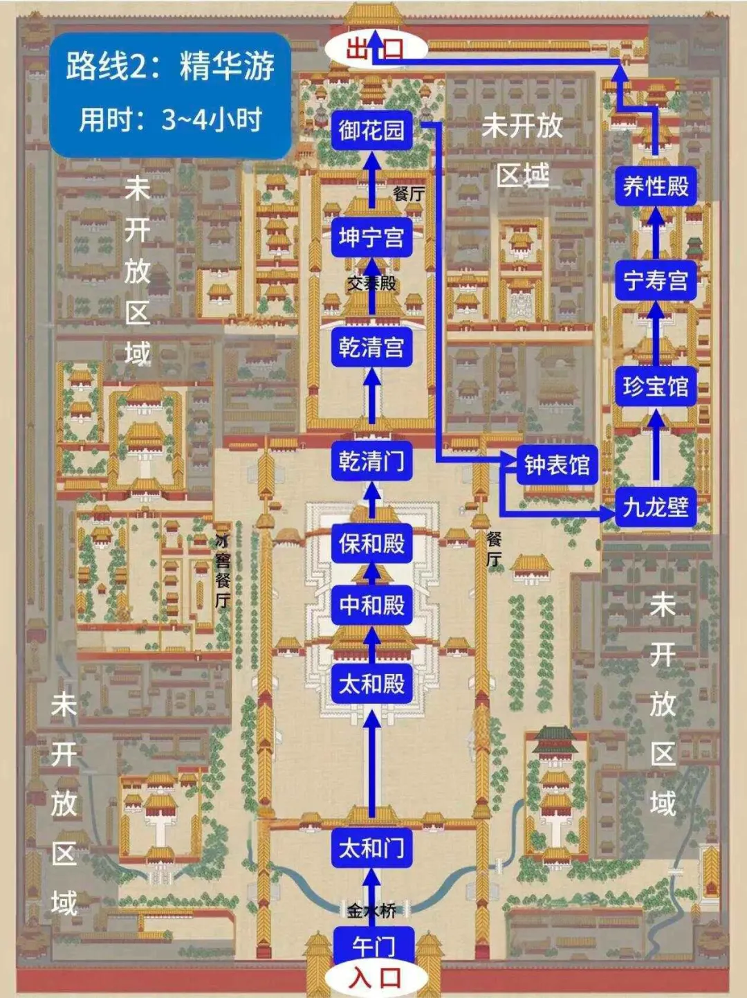 1)中轴线游览:午门 → 太和门 → 太和殿 → 中和殿 → 保和殿 → 乾清宫 → 坤宁宫 → 御花园 → 珍宝馆 → 神武门。这是故宫最经典的游览路线,可以快速领略故宫中轴线主要建筑的风采。