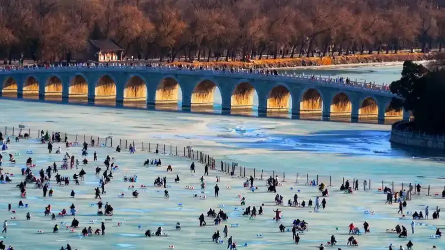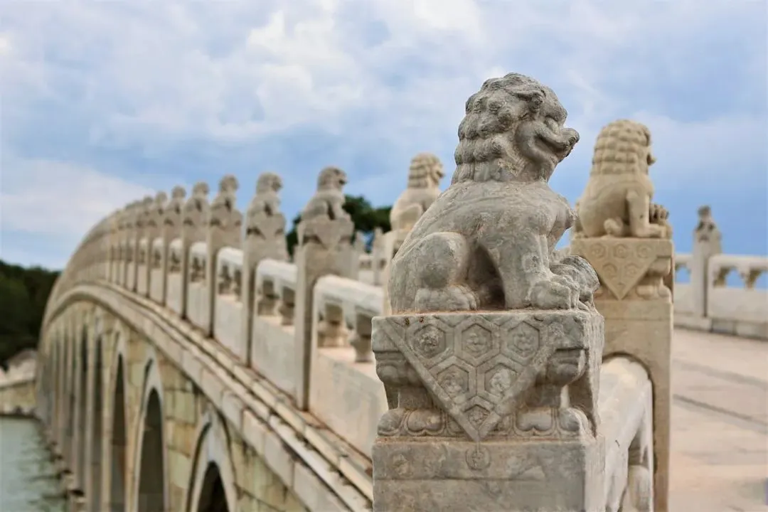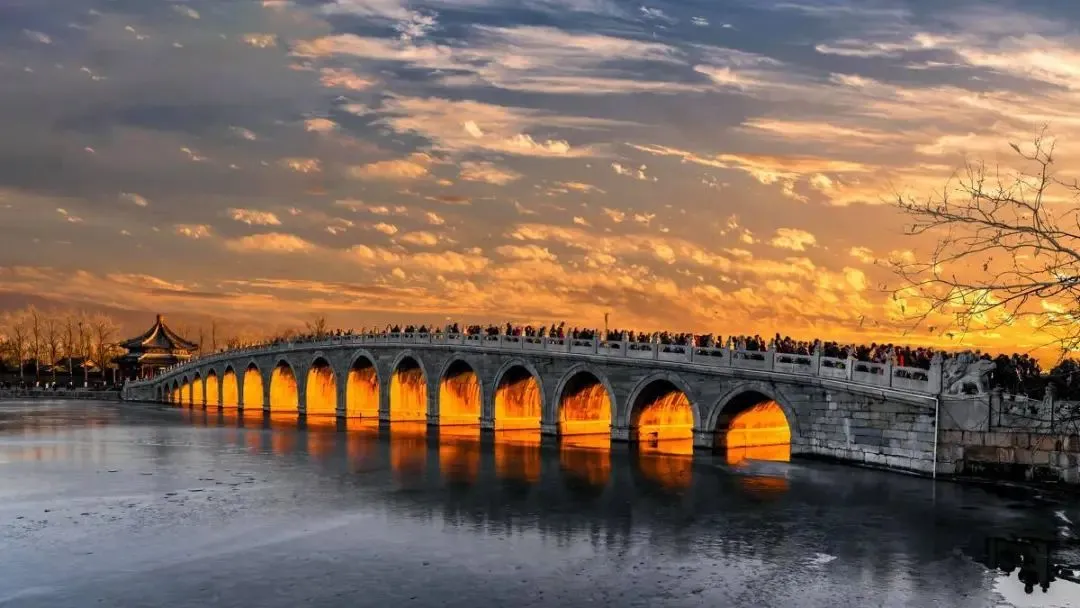 十七孔桥:连接东岸与南湖岛的石桥,桥上有着544只不同样态的石狮子。冬季傍晚时分的“金光穿洞”景象尤为壮观。