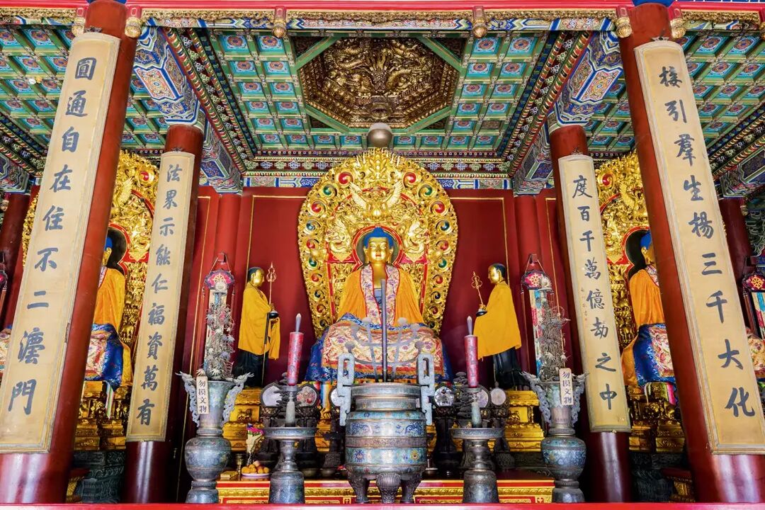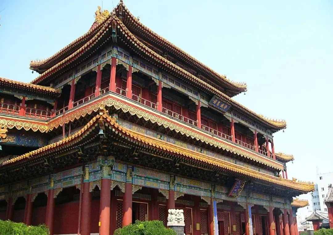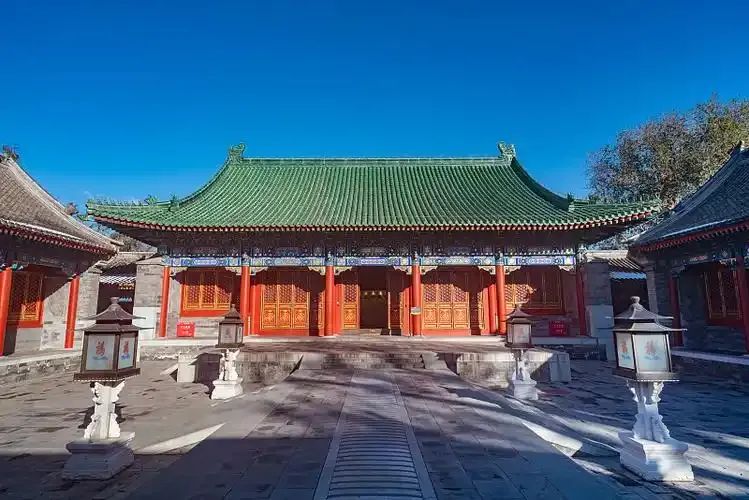 天王殿:又称雍和门,原为王府的宫门,后改建为天王殿。殿内供有布袋尊者和四大天王塑像,以及三尊三世佛像(竖三世佛)。