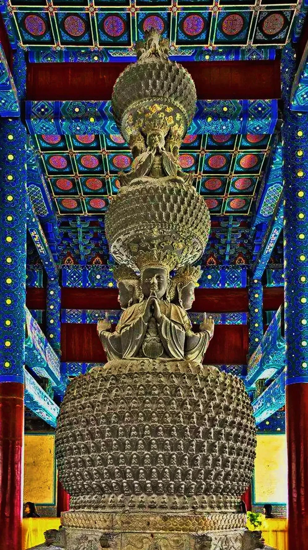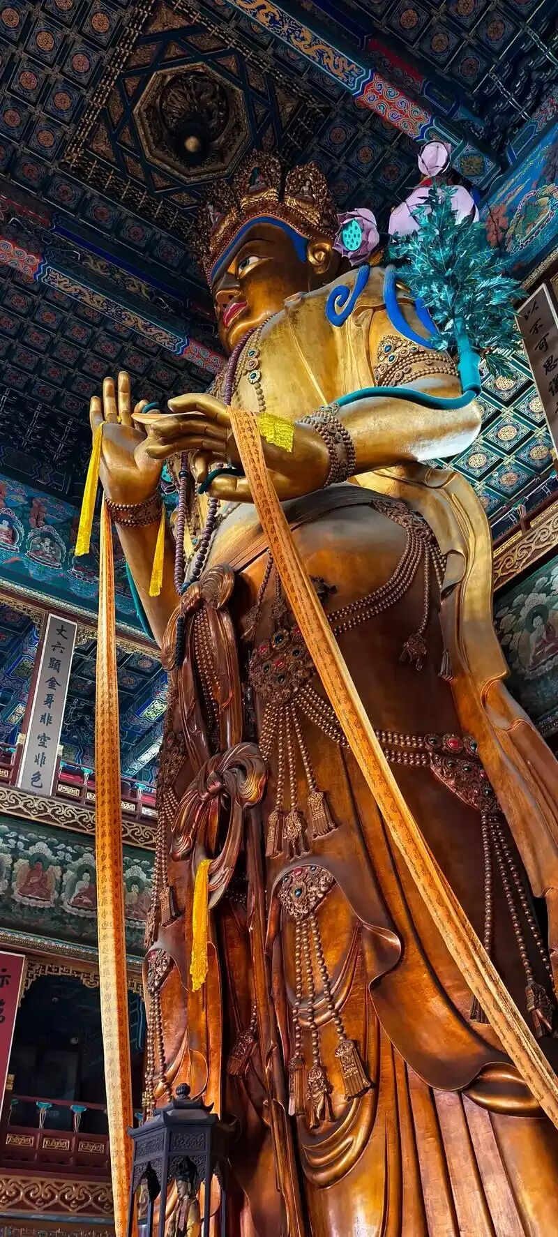 万福阁:是雍和宫寺庙建筑群中北端最高的建筑,高25米。阁内矗立着一尊迈达拉佛,高18米,地下埋入8米,是由整棵名贵的白檀香木雕成。