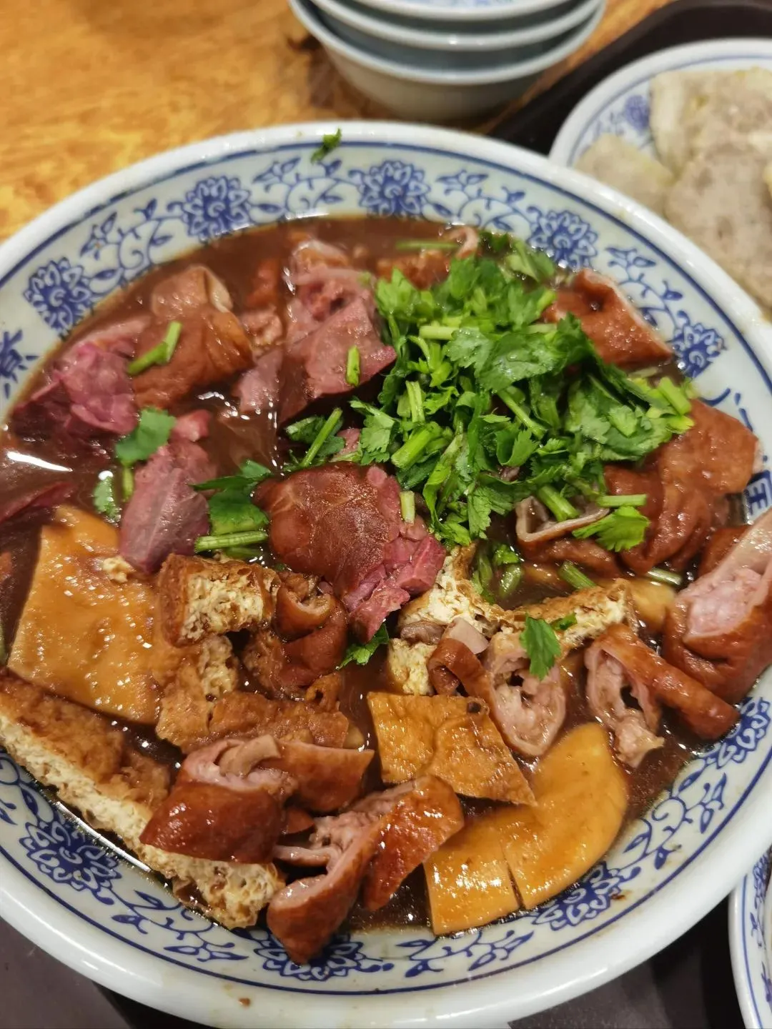 3、卤煮火烧:起源于北京城南,以猪肠和猪肺为主料,搭配火烧、炸豆腐片和卤汁,加入蒜汁、酱豆腐汁等调料。火烧透而不黏,肉质烂而不糟,汤头浓郁咸鲜。
