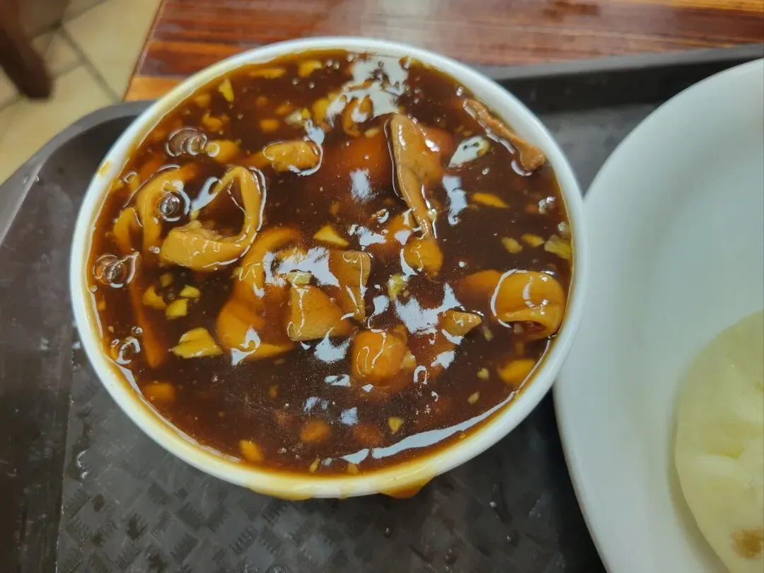 4、炒肝:以猪大肠和猪肝为主料,用淀粉勾芡制成,汤汁油亮酱红,肝香肠肥,味浓不腻。虽名中带“炒”,实为煮制,搭配蒜蓉更地道。