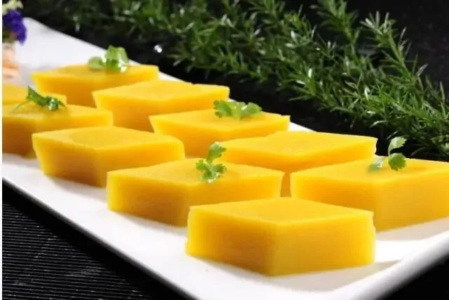 5、豌豆黄:北京春季应时佳品,选用优质白豌豆、红枣和白糖,经煮烂、糖沙和凝结制成。色泽浅黄,口感清凉爽口,甜香细腻。