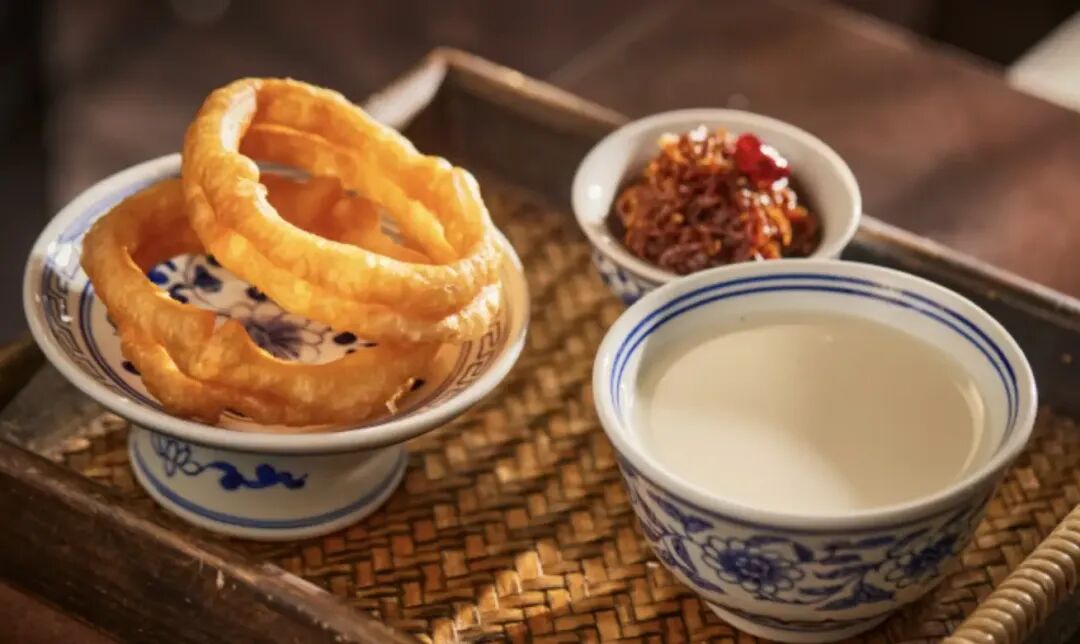 9、豆汁儿+焦圈:豆汁儿以绿豆发酵制成,酸香微甜,搭配金黄酥脆的焦圈和咸菜,是老北京人早餐的经典组合。