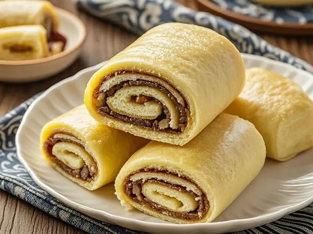 14、芸豆卷:以芸豆和豆沙为主料,色泽雪白,质地柔软细腻。制作时需将芸豆煮熟去皮,碾成泥后加入糖调味,再卷成圆柱形切块。