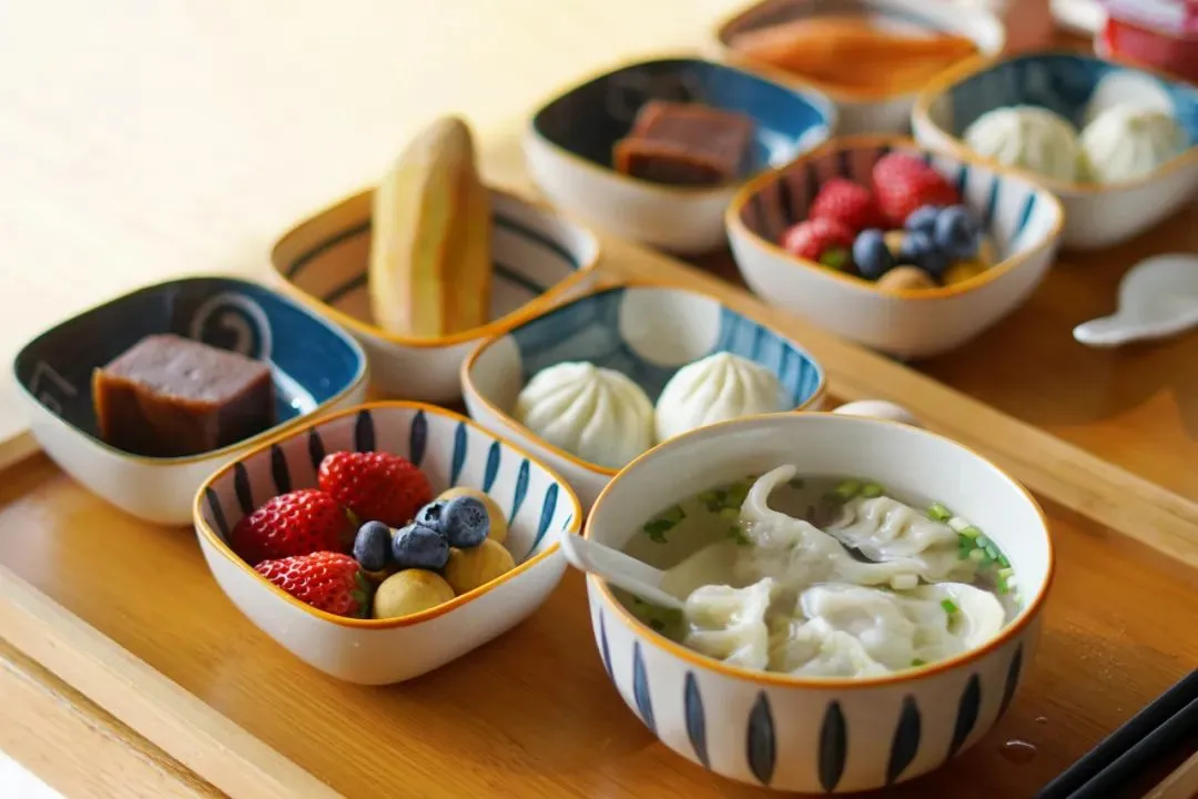 一碗热气腾腾的饺子,各种新鲜蔬果,