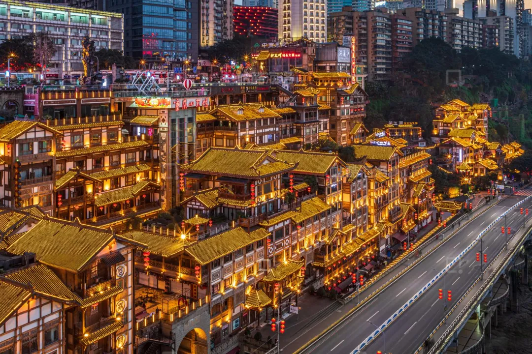 吊脚楼群:洪崖洞绝壁悬崖上的“吊脚楼群”,是独特的巴渝传统建筑,被誉为新重庆的“城市名片”。