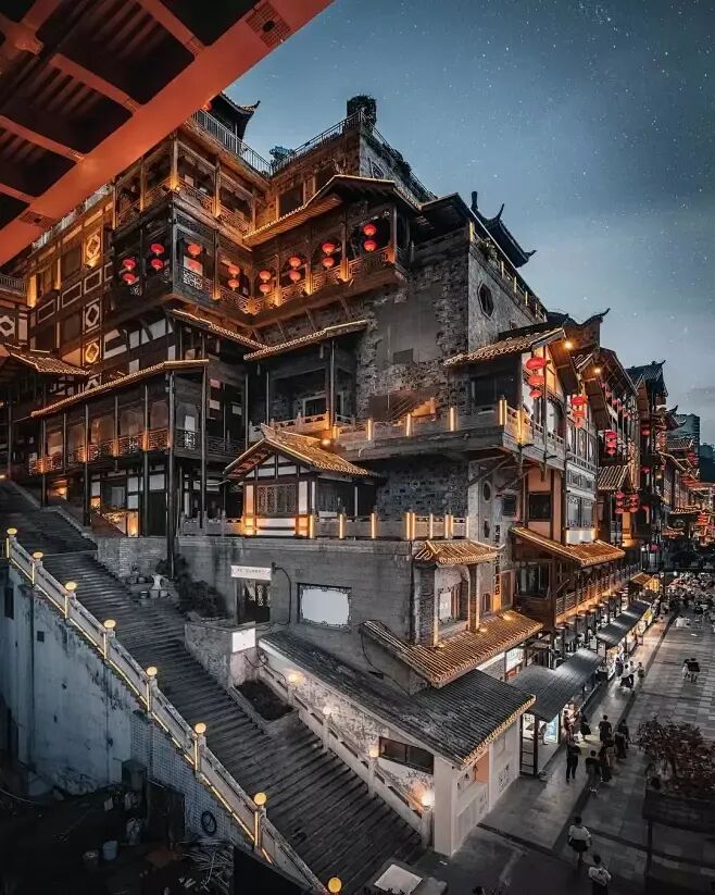 磁器口后街:融合传统与现代的商业区,24小时业态包含精品酒店、文创IP、赛博朋克灯笼巷等。