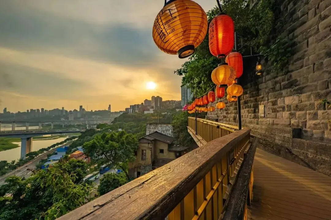 悬空栈道:300米的悬空栈道沿着古城墙遗址而建,一侧是陡峭的崖壁,一侧是开阔的长江江景。漫步其上,江风拂面,江面上船只往来,对岸的城市风光尽收眼底。夜晚,栈道上红灯笼亮起,与江对岸的灯火交相辉映,美轮美奂。