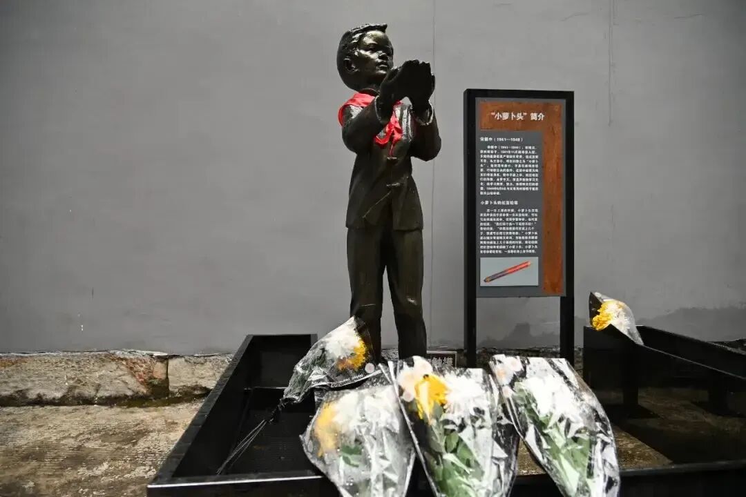 “小萝卜头”宋振中塑像:塑像位于白公馆入口处,展现了这位年仅8岁就英勇就义的小烈士的形象。塑像下方摆放着游人所献的鲜花,表达着对这位小英雄的深切缅怀与敬仰。