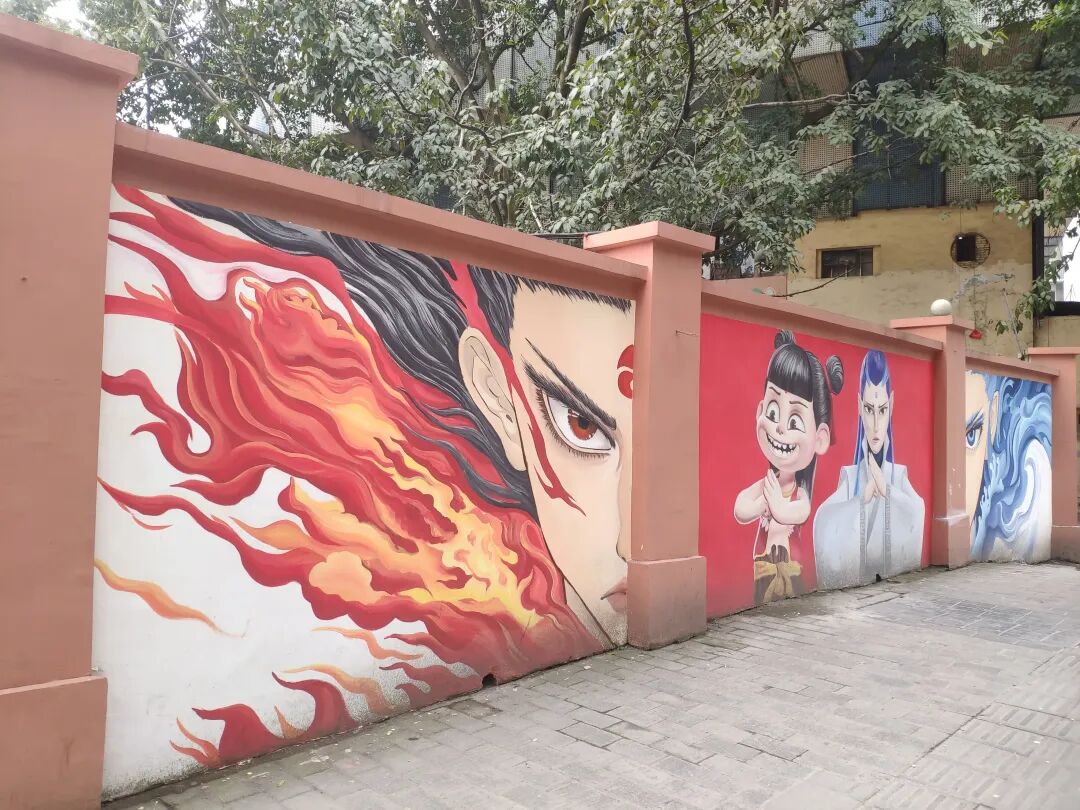 哪吒主题涂鸦:随着电影《哪吒2》的热映,黄桷坪涂鸦街也新增了许多哪吒系列人物涂鸦,吸引了大量游客前来打卡拍照。