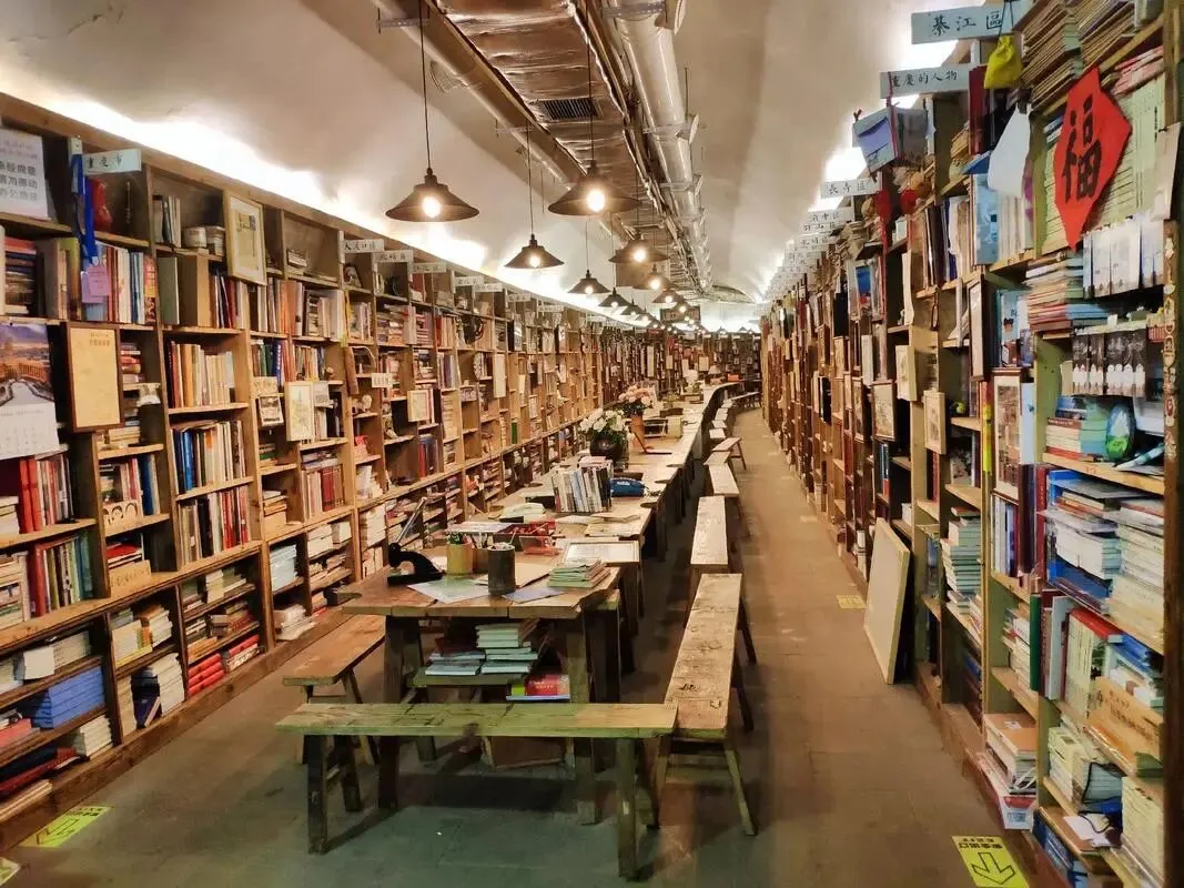 军哥书屋防空洞:钻进涂鸦街尽头的地堡,3000本绝版书堆在抗战时期的防空洞里。老板军哥用捡来的铁轨枕木当书架,重庆老地图糊满洞顶,洞口还有自助茶摊,充满文艺气息。