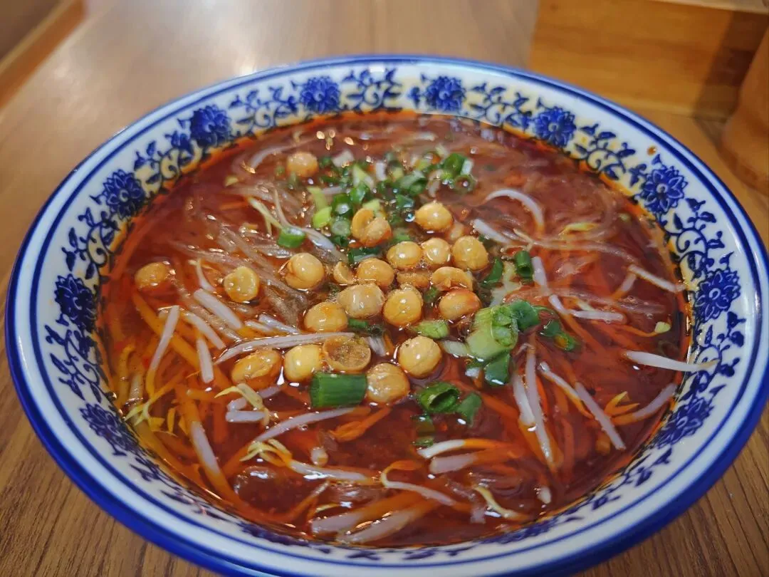 6、酸辣粉:手工红薯粉爽滑弹牙,酸辣汤汁中加入肉酱、黄豆、豌豆,解放碑“好又来”酸辣粉常年排队。