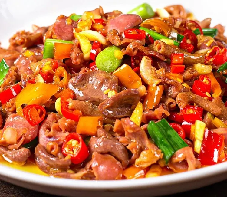 9、泡椒鸡杂:以腌制后的鸡胗、鸡心、鸡肝等内脏,搭配泡椒、蒜、西芹等炒制而成,口感酸辣开胃,是重庆特色家常菜之一。