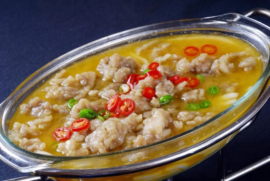 15、滑肉:煮熟后的滑肉搭配特制的辣椒酱或红油,层次分明,味道饱满,展现了重庆美食的独特风味。