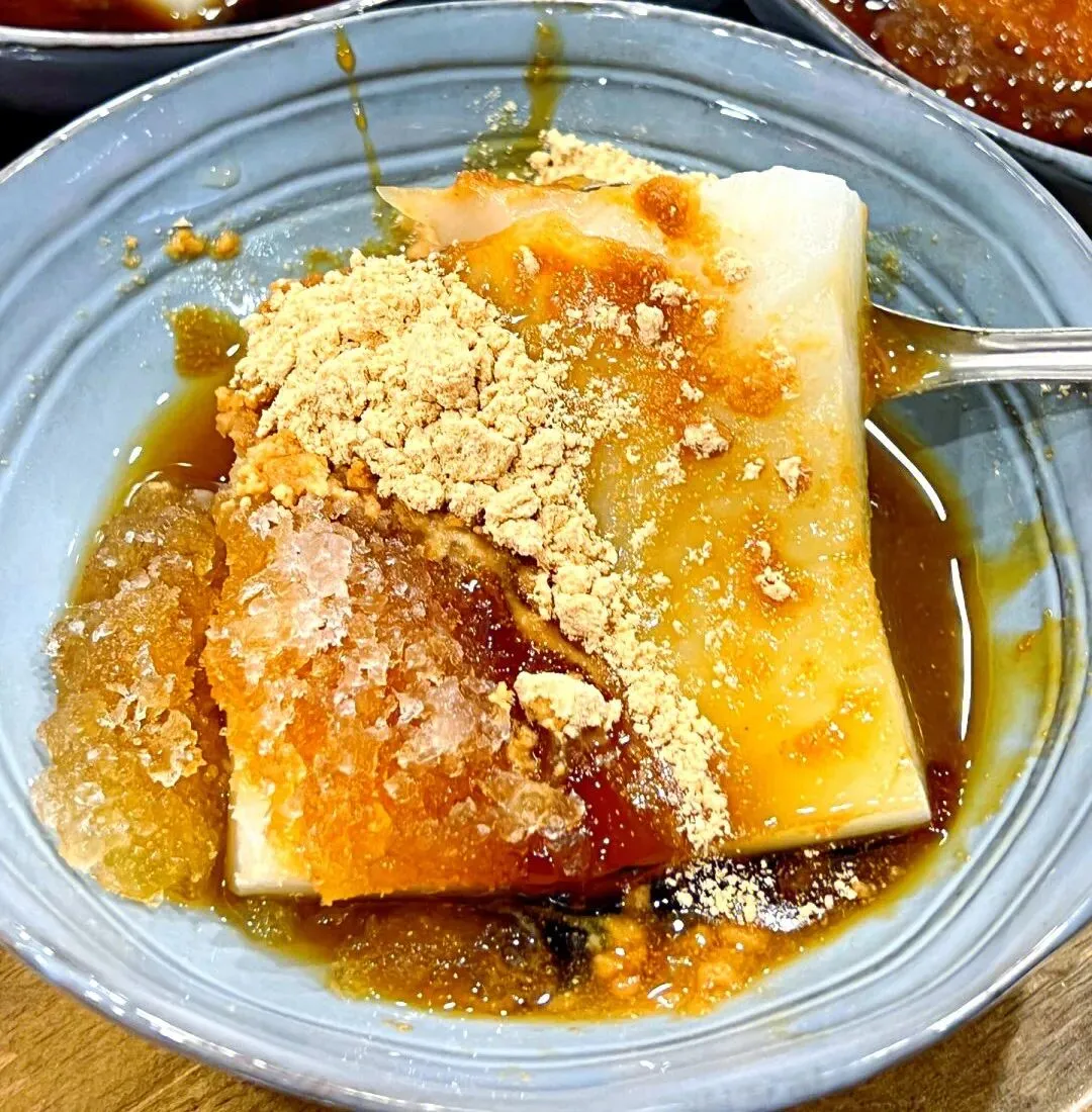 17、凉糕:色泽清亮、口感细腻的小吃,主要由糯米和甜糖浆制成,搭配清甜的糖浆,口感清新,是夏季街头常见的消暑小食。
