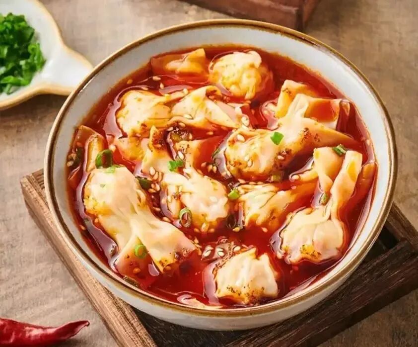 19、抄手:以薄面皮包裹鲜美肉馅,煮熟后搭配辣椒油、香醋等调料,口感皮薄馅嫩,麻辣鲜香,是重庆的经典面食之一。